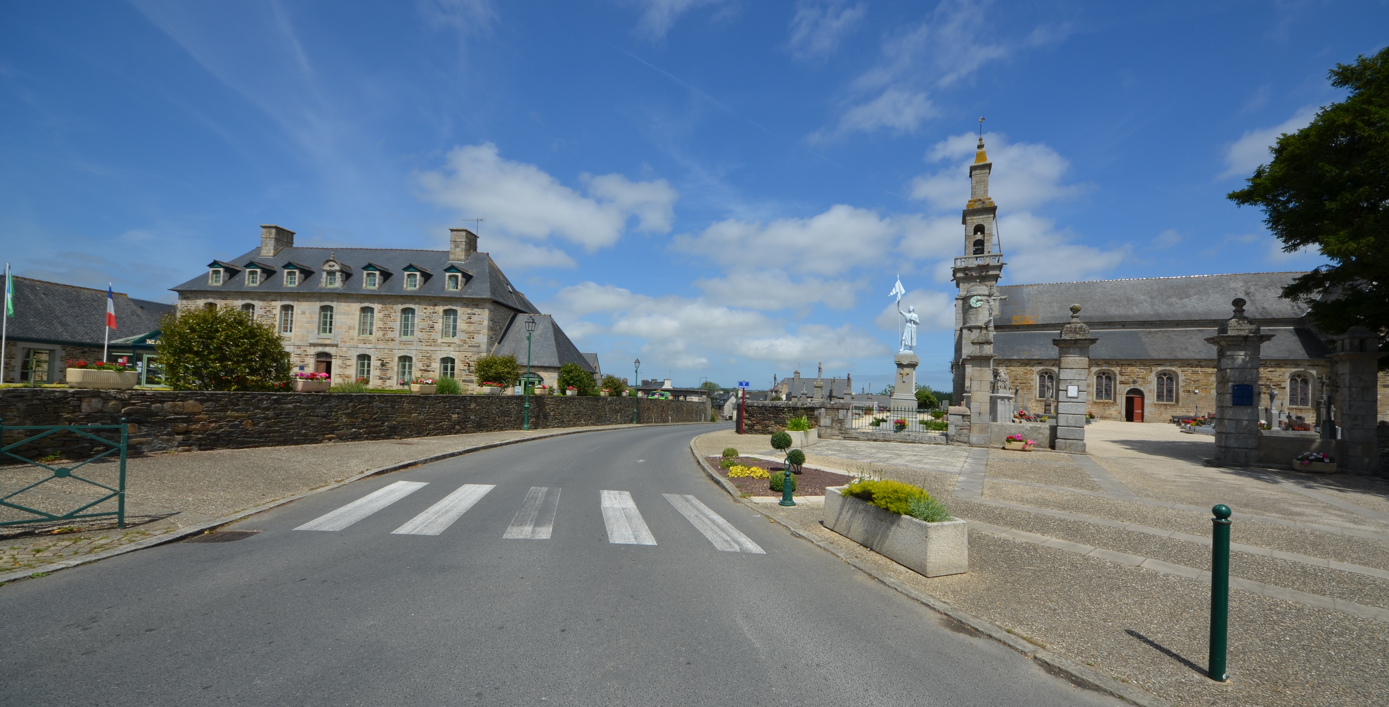 Langoat, le bourg : presbytère aujourd'hui mairie et église paroissiale Sainte-Pompée, vue de situation depuis le sudImmatriculation