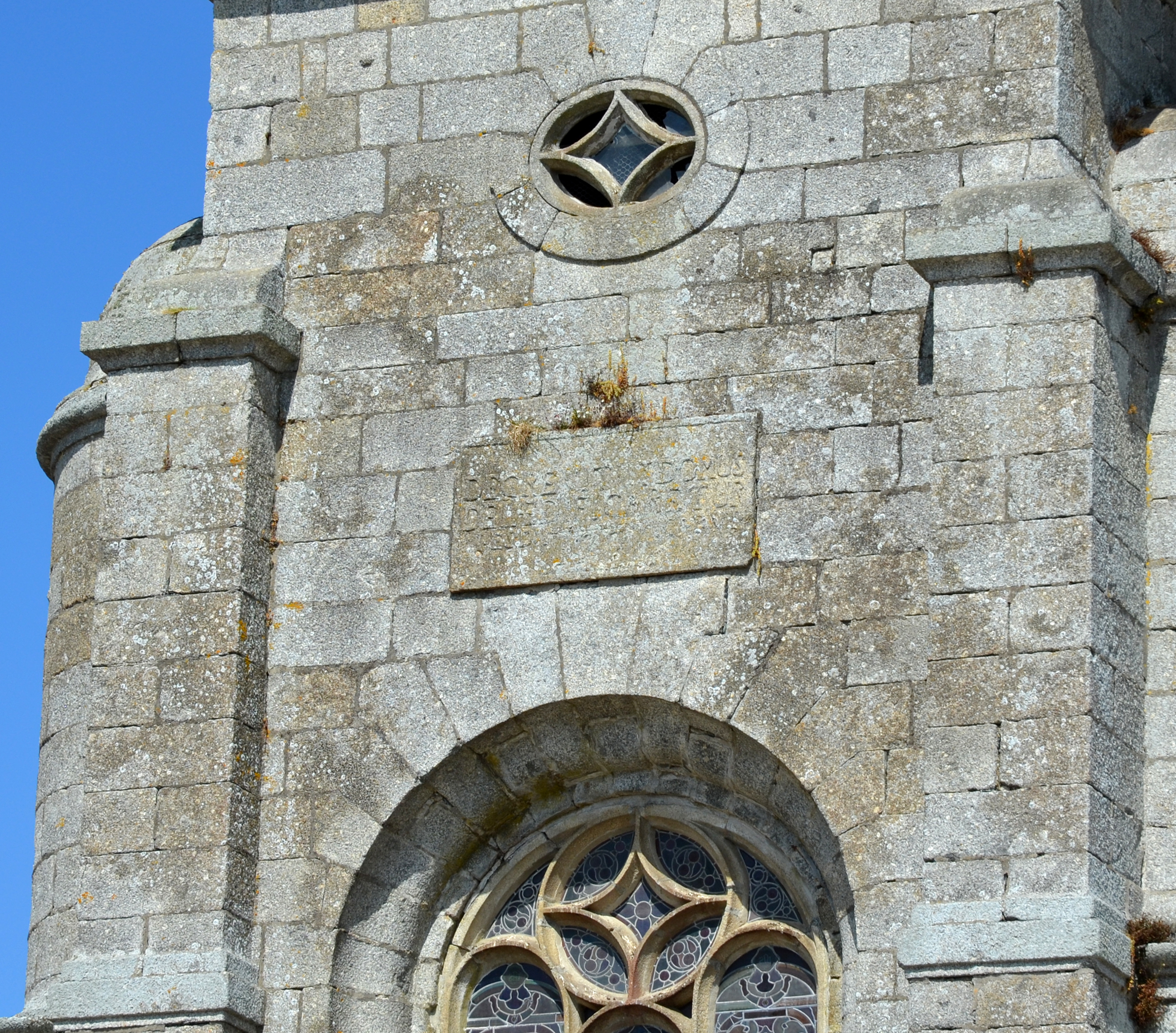 Langoat, le bourg : église paroissiale Sainte-Pompée, clocher-tour, vue depuis l'ouest. Détail de l'inscription : DECREVIT UT DOMUS DEI AEDIFICARETUR 1771Immatriculation