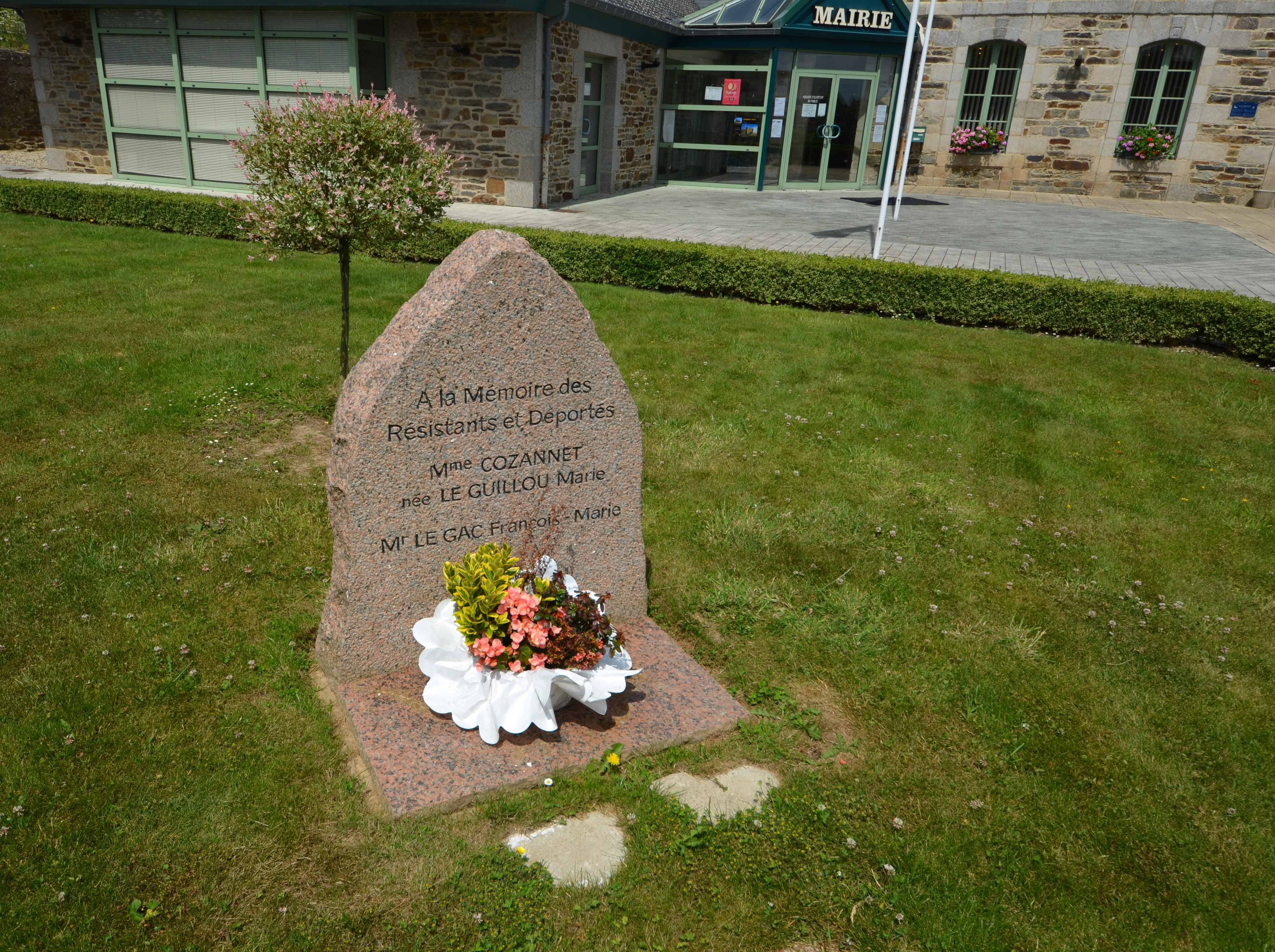Langoat, le bourg : monument commémoratif situé devant le presbytère aujourd'hui mairie. Il porte l'inscription suivante : "A la Mémoire des Résistants et Déportés Mme Cozannet née Le Guillou Marie / Mr Le Gac François-Marie"Immatriculation