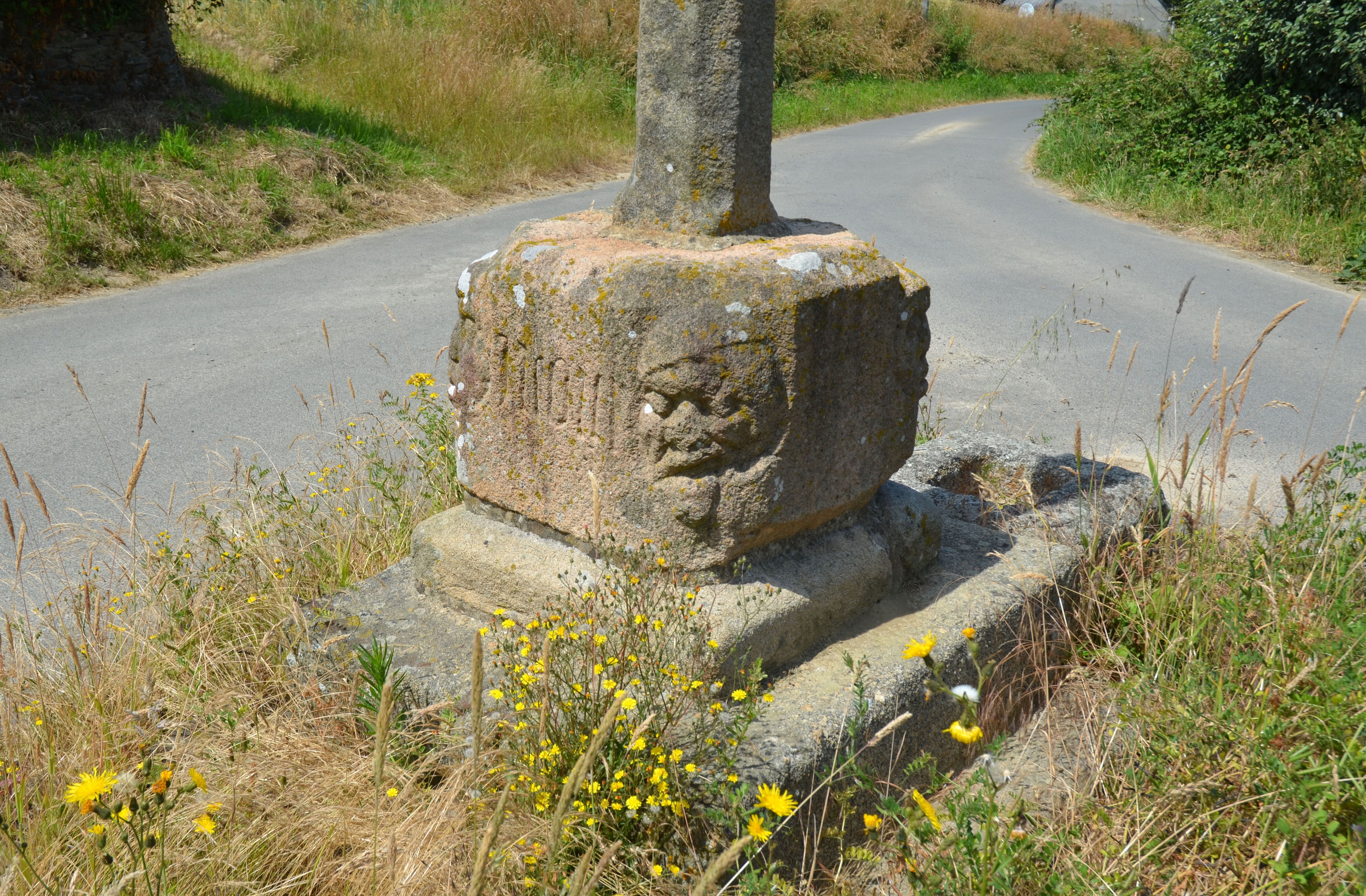 Langoat, carrefour des convenants Tano, Lucas et Pichoret : croix de chemin de Kervot, détail du socle sculptéImmatriculation