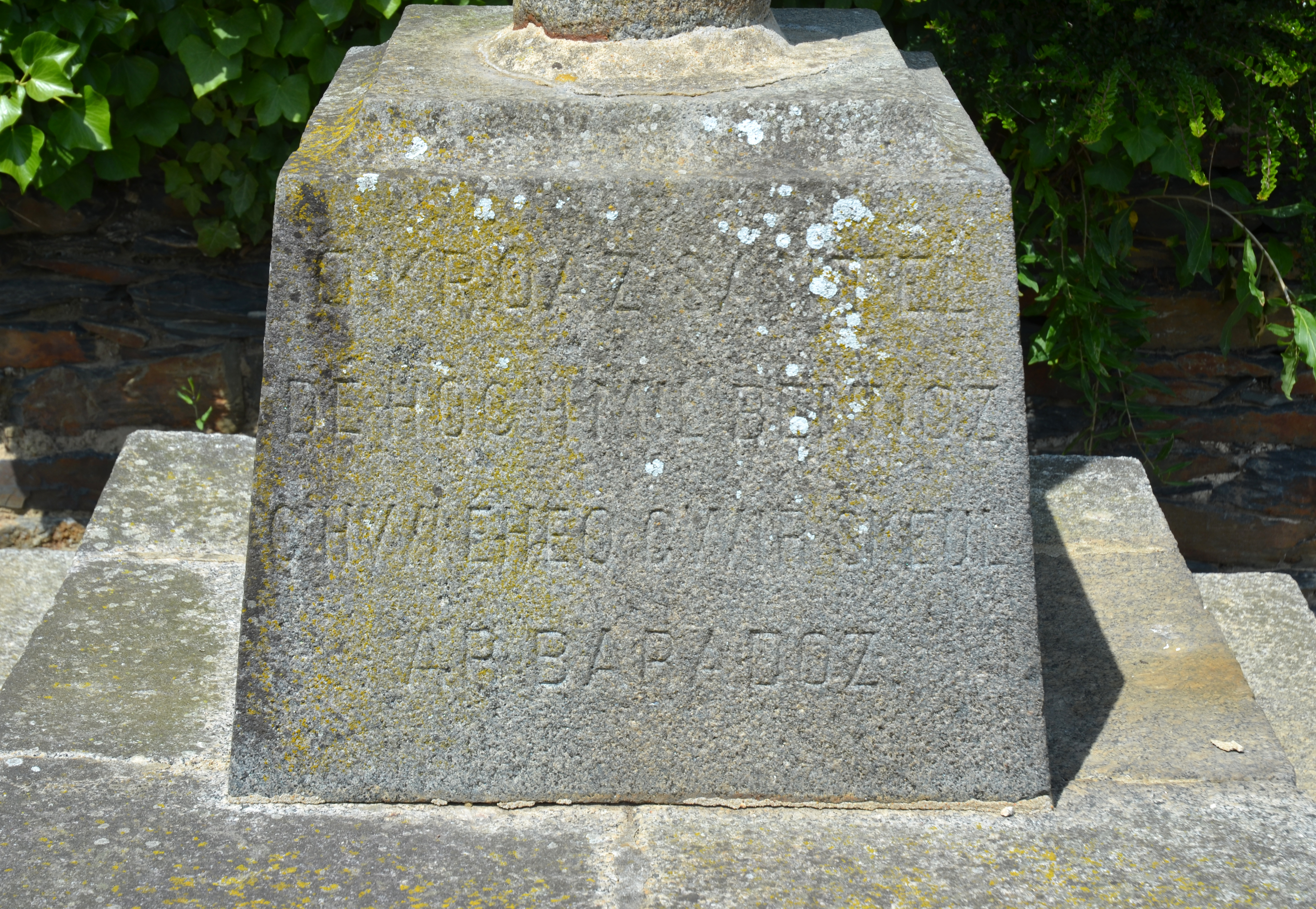 Langoat, Kervot ("Kervod") : croix de type Hernot datée de 1874, détail du socle, inscriptionImmatriculation
