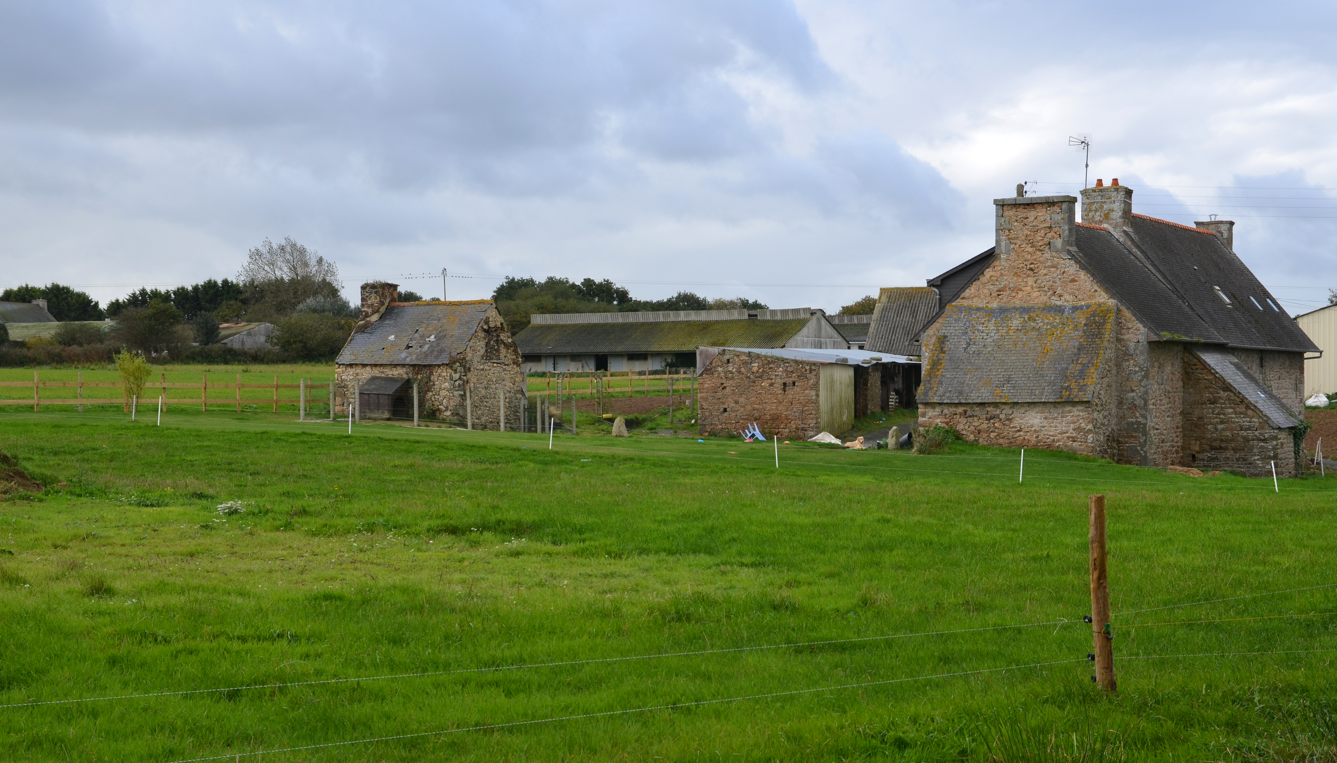 Langoat, Convenant Darval : ferme et son fournil depuis le nord-est. Ce logis conserve des éléments anciens (portes et fenêtre du 16e siècle). On sait qu'en 1510, le dénommé Yves Darval était procureur de la Fabrique de la paroisseImmatriculation