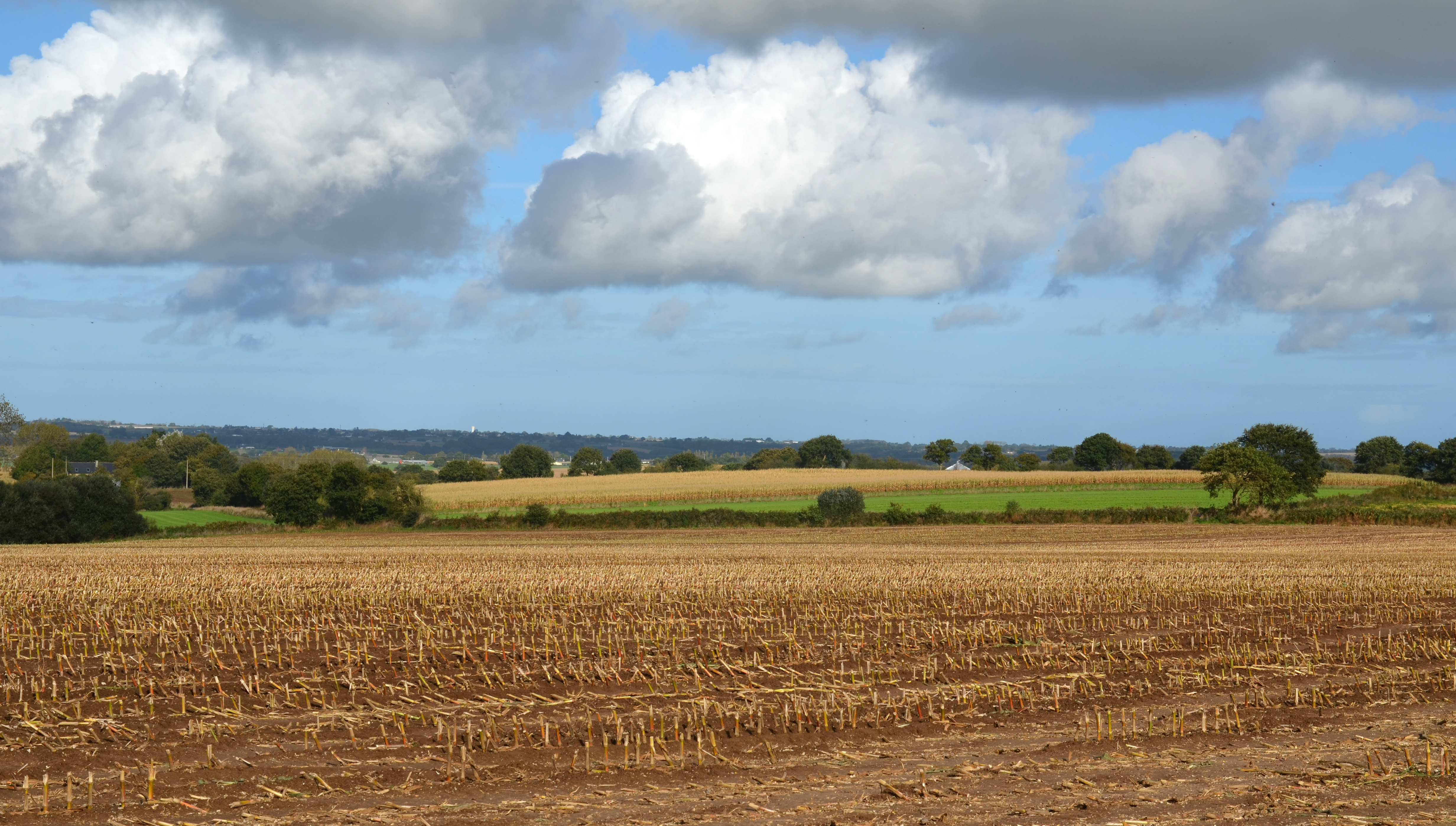 Langoat, au sud-ouest de Kerhuel : le paysage vers le nord-ouest. Au premier plan : le maïs vient d'être récoltéImmatriculation