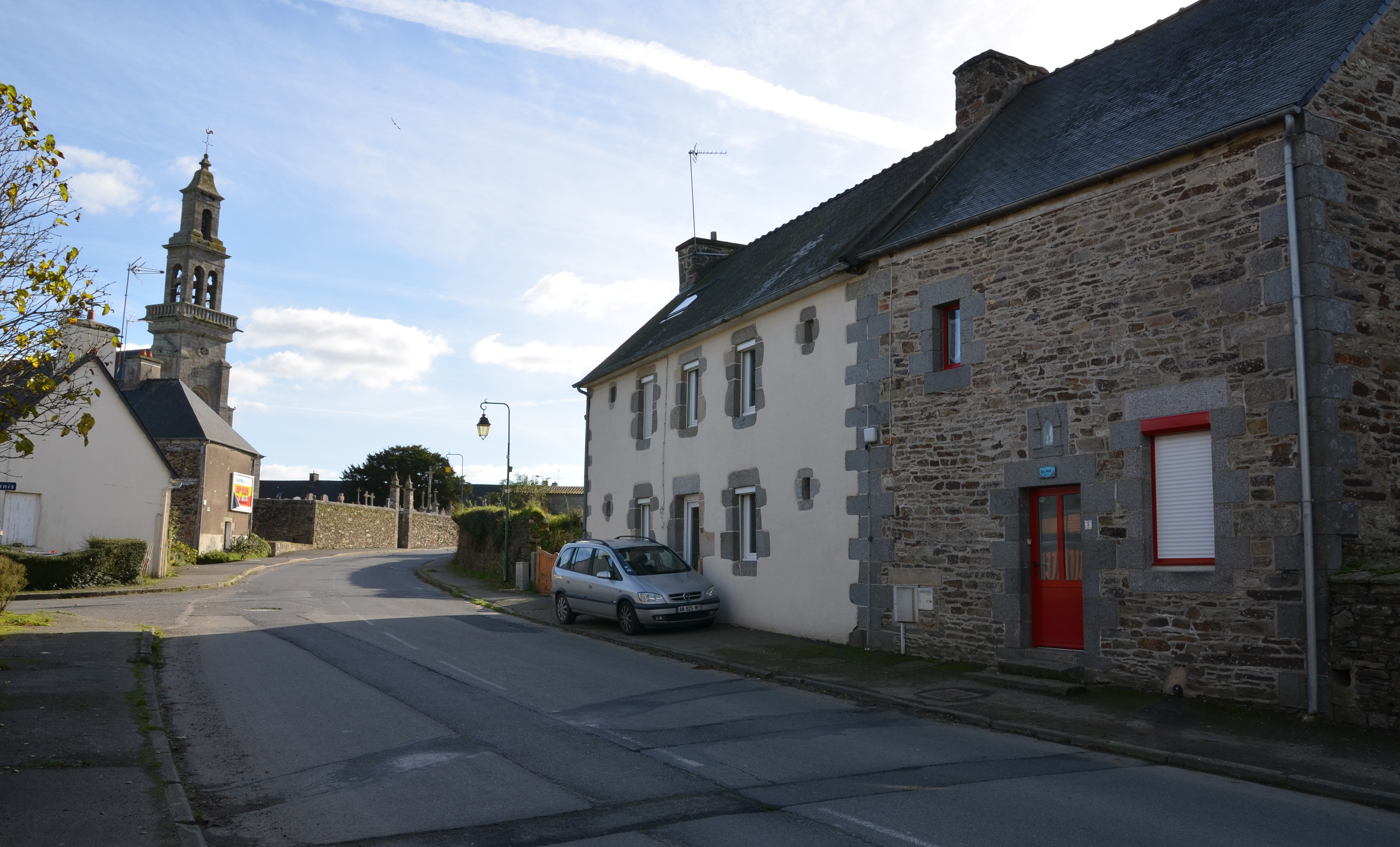 Langoat, le bourg (nord-ouest) : vue générale vers l'est-sud-est et l'église paroissiale depuis la rue Sainte-PompéeImmatriculation