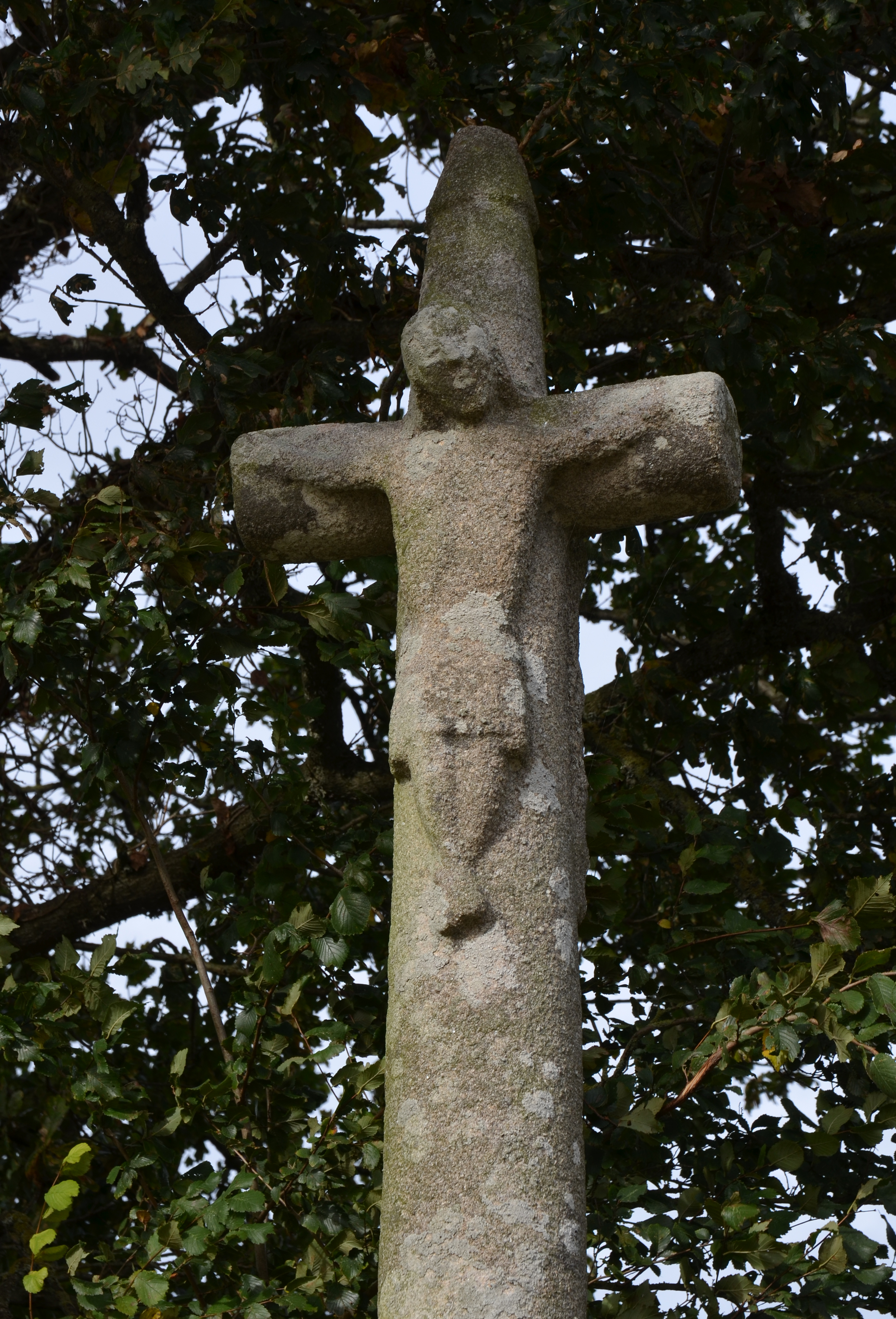 Langoat, carrefour à l'ouest de Porz Ru : croix de chemin (1ère moitié 17e siècle : ?), Christ en croix, vue de détailImmatriculation