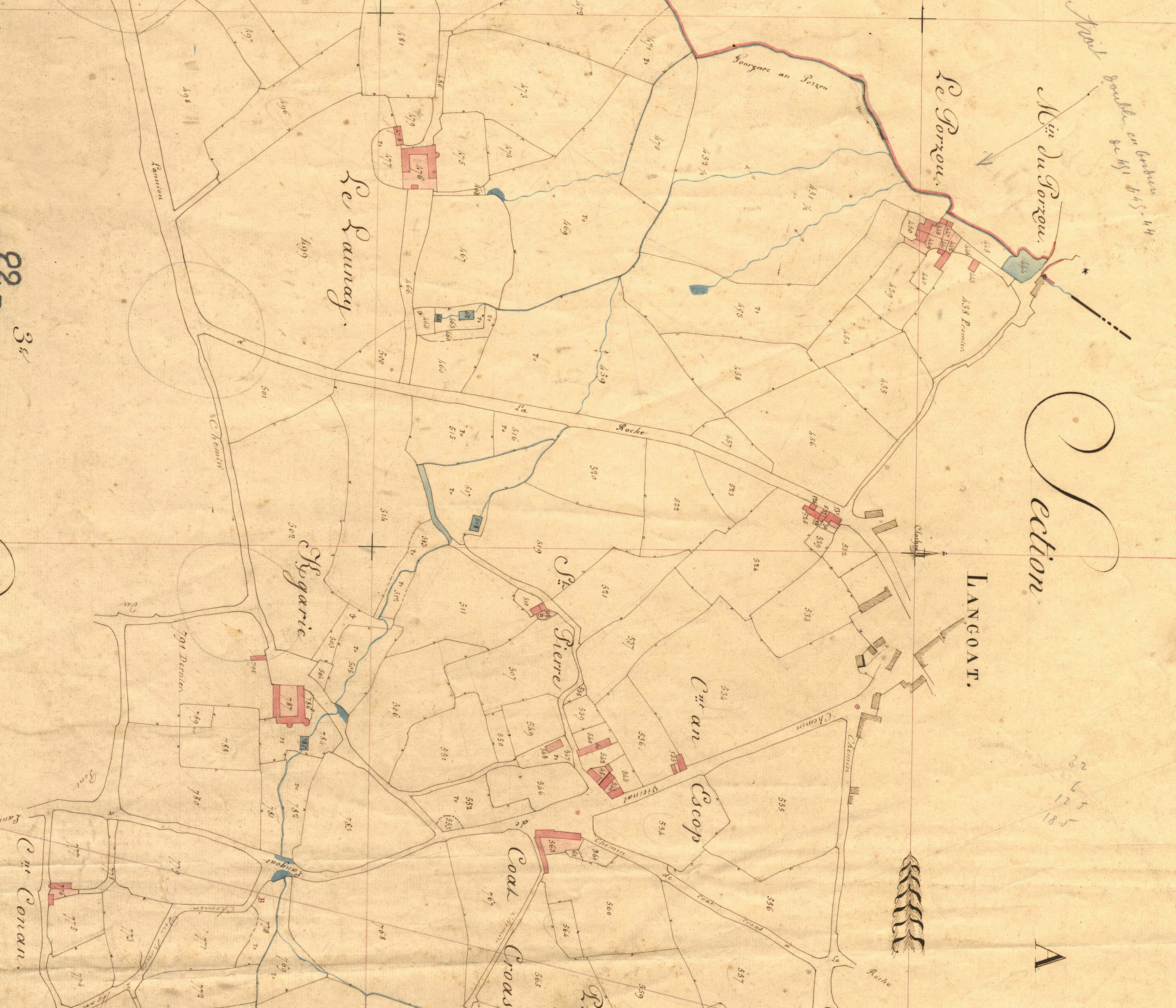 Extrait du cadastre ancien de la commune de Langoat, 1836 : partie occidentale du bourg de Langoat jusqu'à Kergaric à l'ouest et Le Launay au nordImmatriculation