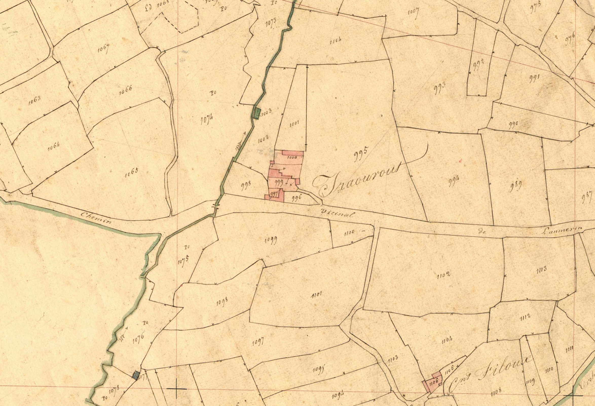 Extrait du cadastre ancien de la commune de Langoat, 1836 : Traou Rout. Le manoir se trouve immédiatement au nord du chemin vicinal de Lanmérin à LangoatImmatriculation