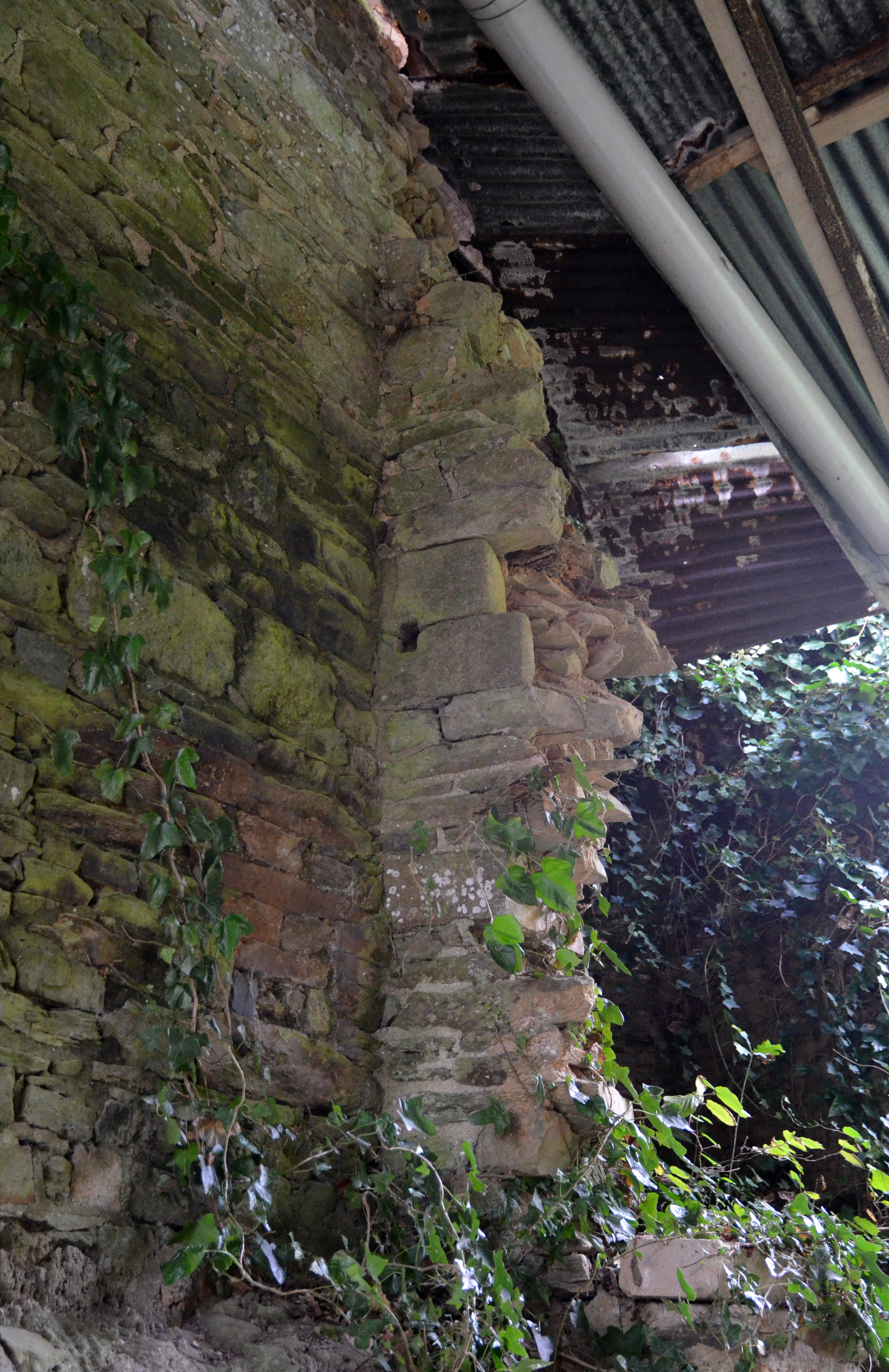 Langoat, Le Château : manoir de Lézeven, élévation postérieure orientée vers le nord, angle nord-ouest, vestiges de la tour d'escalier, traces d'arrachement... Une petite ouverture de tir de forme carrée, flanquant la façade arrière, a été conservéeImmatriculation
