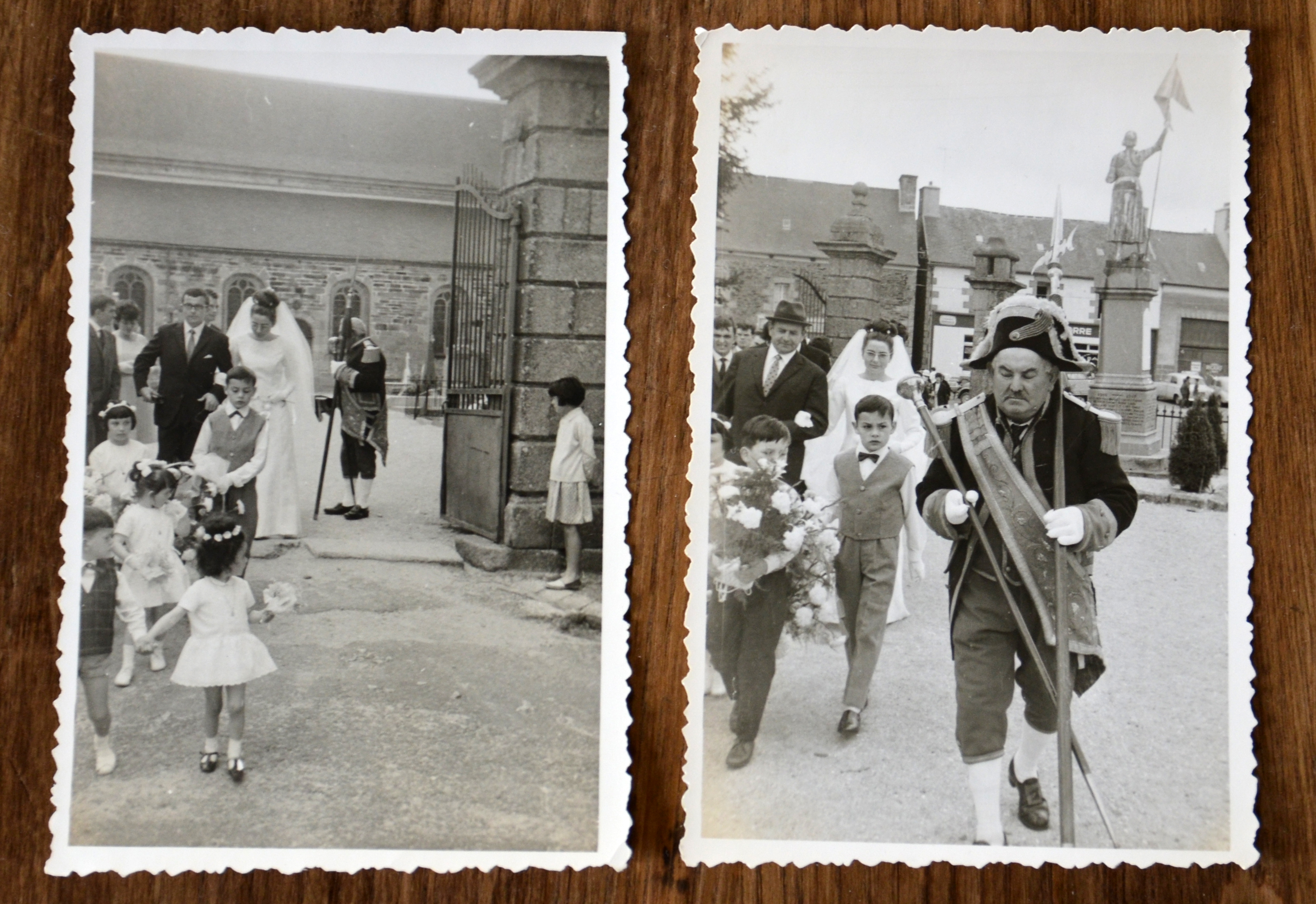 Langoat, le bourg : l'église paroissiale Sainte-Pompée à la sortie du mariage de Jean Le Morvan et Brigitte Henry le 5 août 1965, uniforme de Suisse d'église ou bedeau porté par Eugène Richard. Il s'agit ici de l'uniforme rouge, d'apparat pour les cérémonies et grandes célébrationsImmatriculation