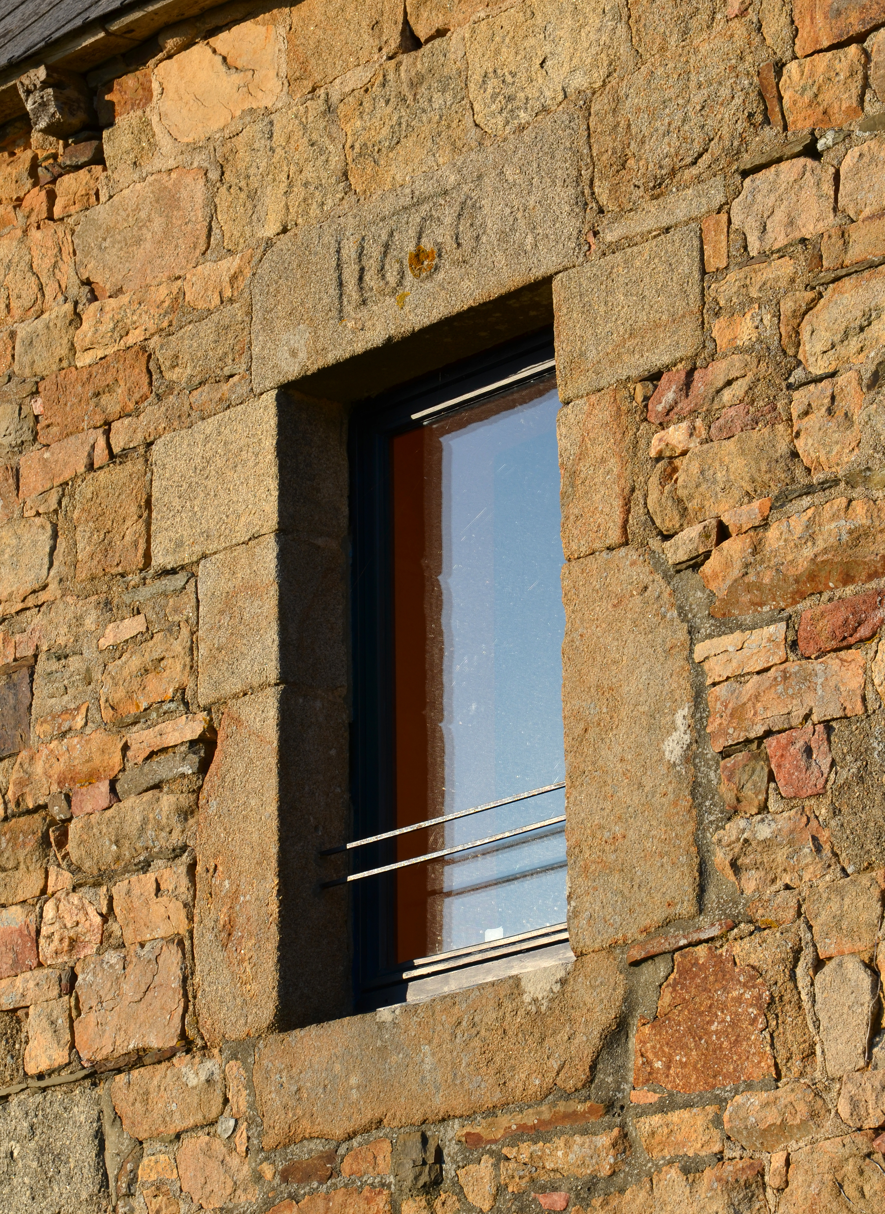 Mantallot, au nord du Bourg : manoir de Kerilis, élévation antérieure orientée vers le sud, vue de détail des ouvertures de la partie est. Le linteau de fenêtre de l'étage est daté par millésime de 1666Immatriculation