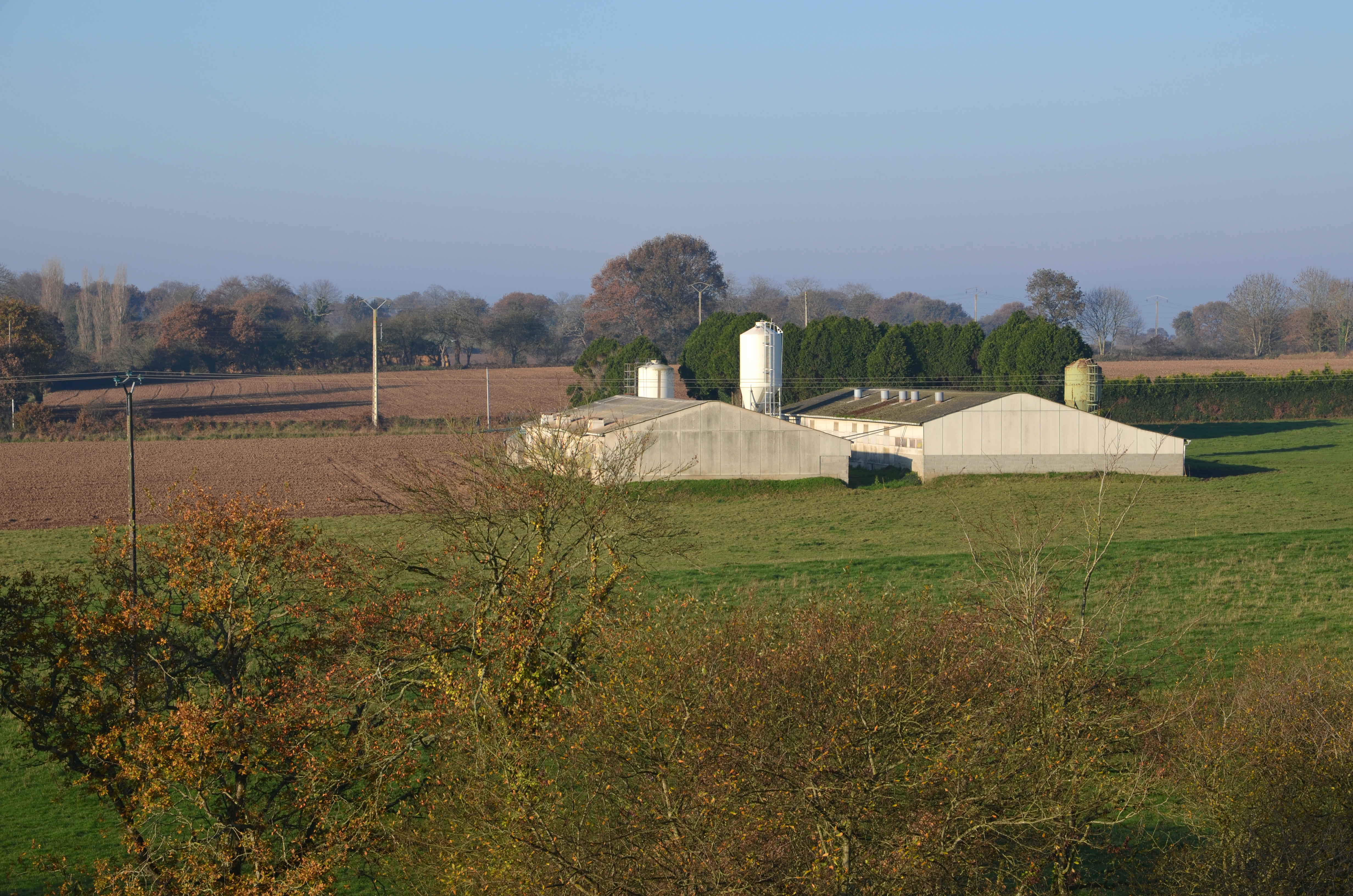 Mantallot : vue générale du bourg vers l'ouest depuis le clocher de l'église paroissiale, élevage hors-solImmatriculation