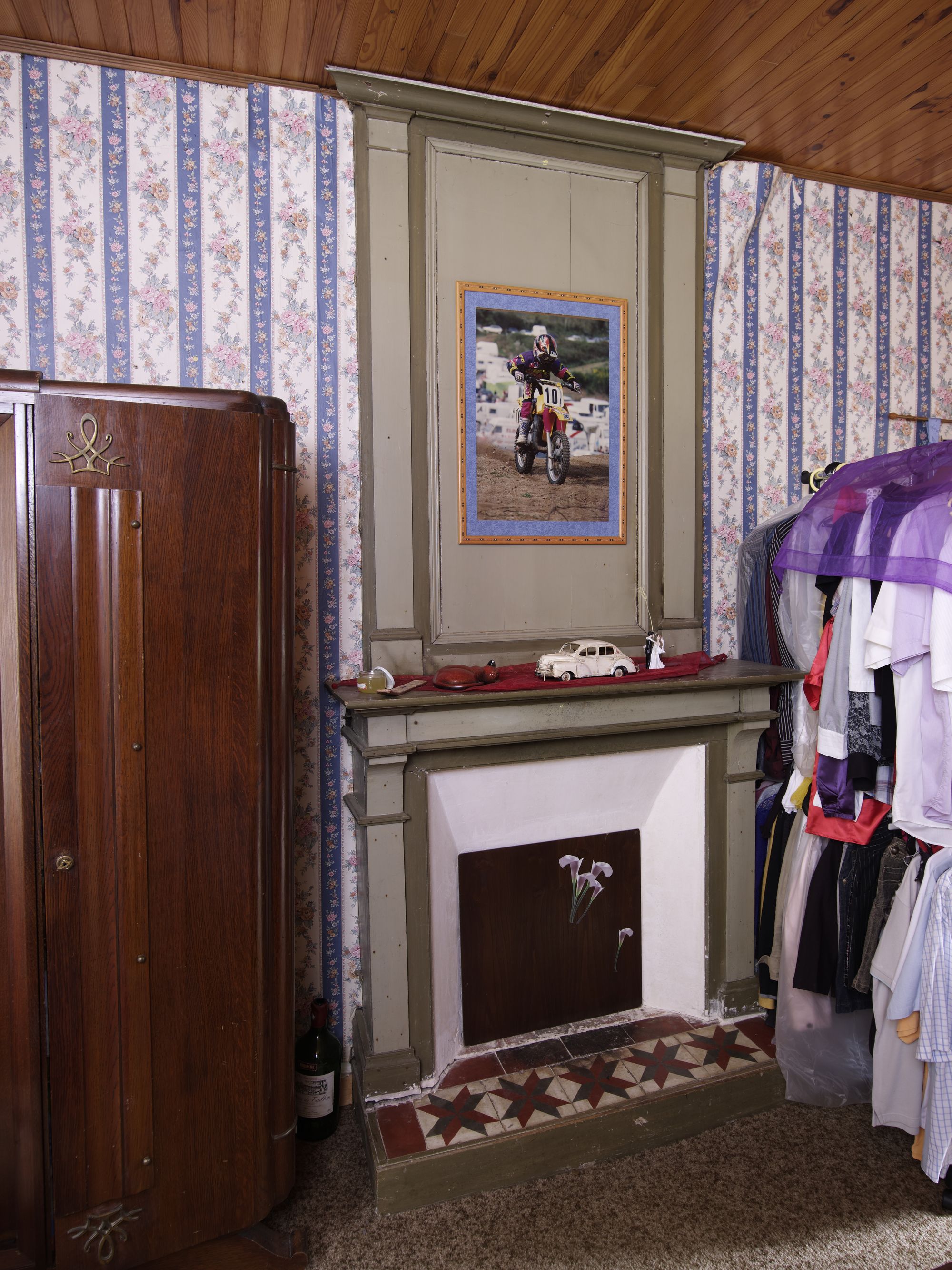 Intérieur de la maison. Etage. Détail d'une cheminée en boisImmatriculation