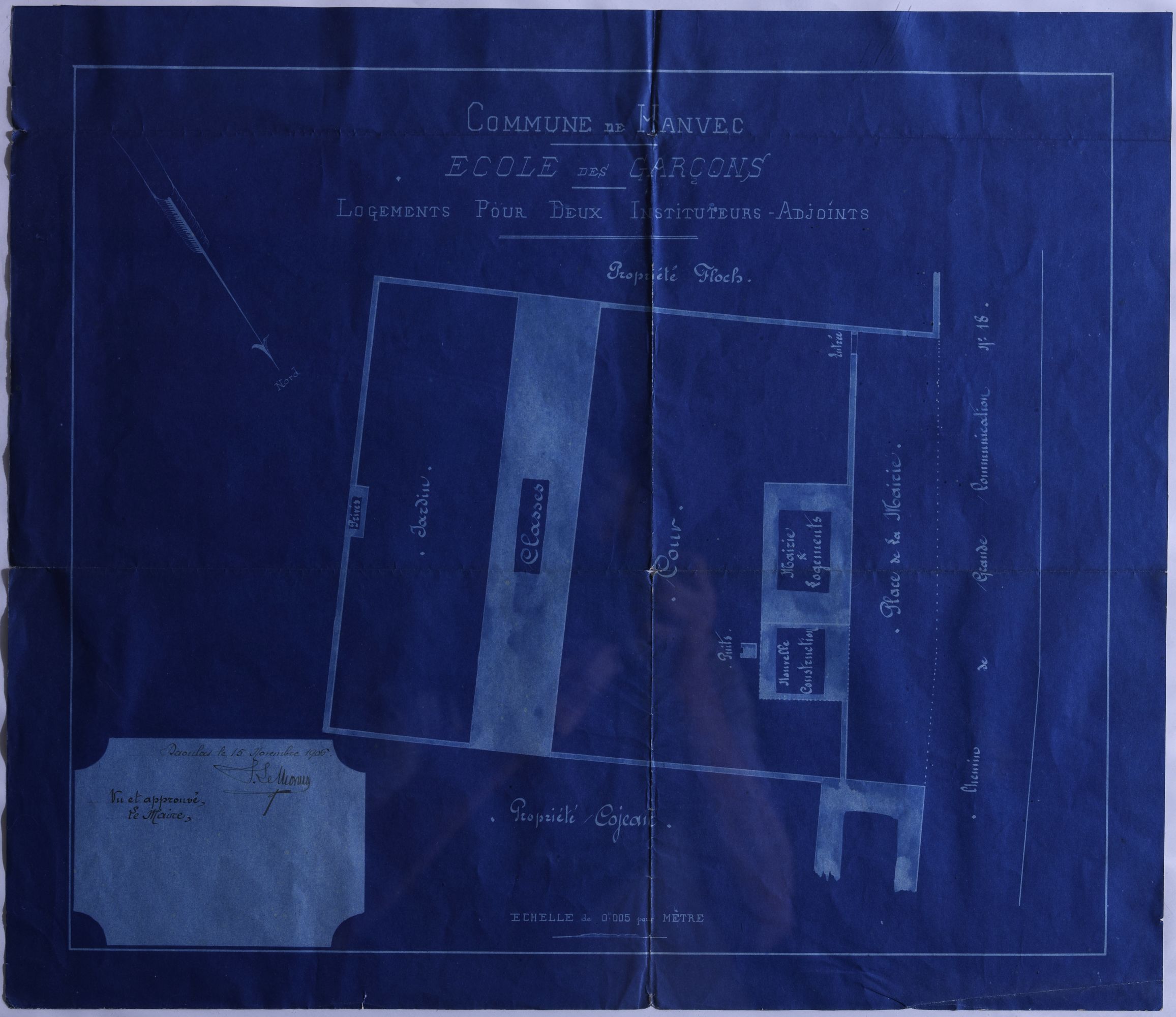 Plan-masse pour les logements de deux instituteurs adjoints à l'école de garçons, route du Faou, 1908 (Archives municipales)Immatriculation
