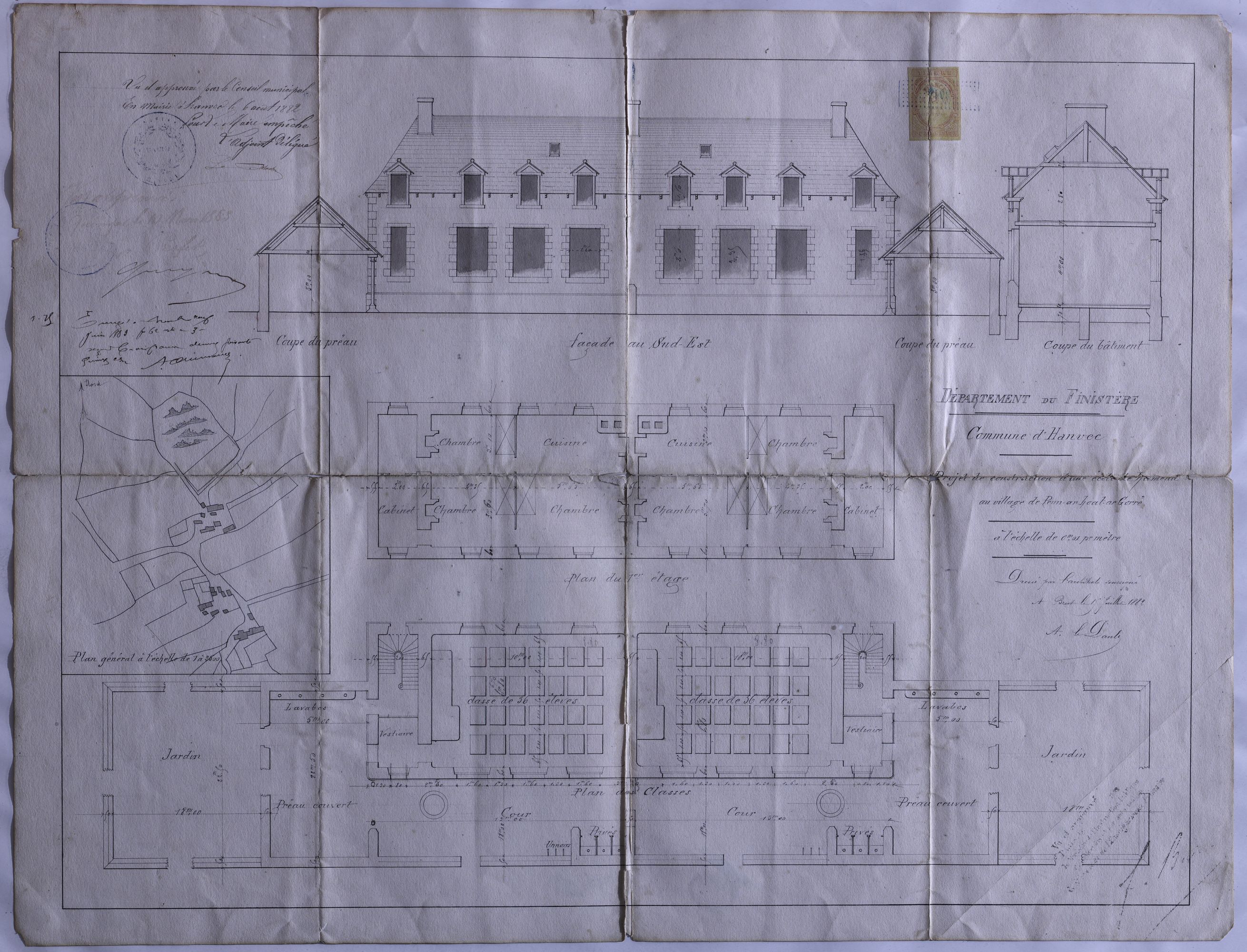 Projet de construction d'une école de garçons-mairie, route du Faou, 1882. Plans, élévations et coupes (archives municipales)Immatriculation