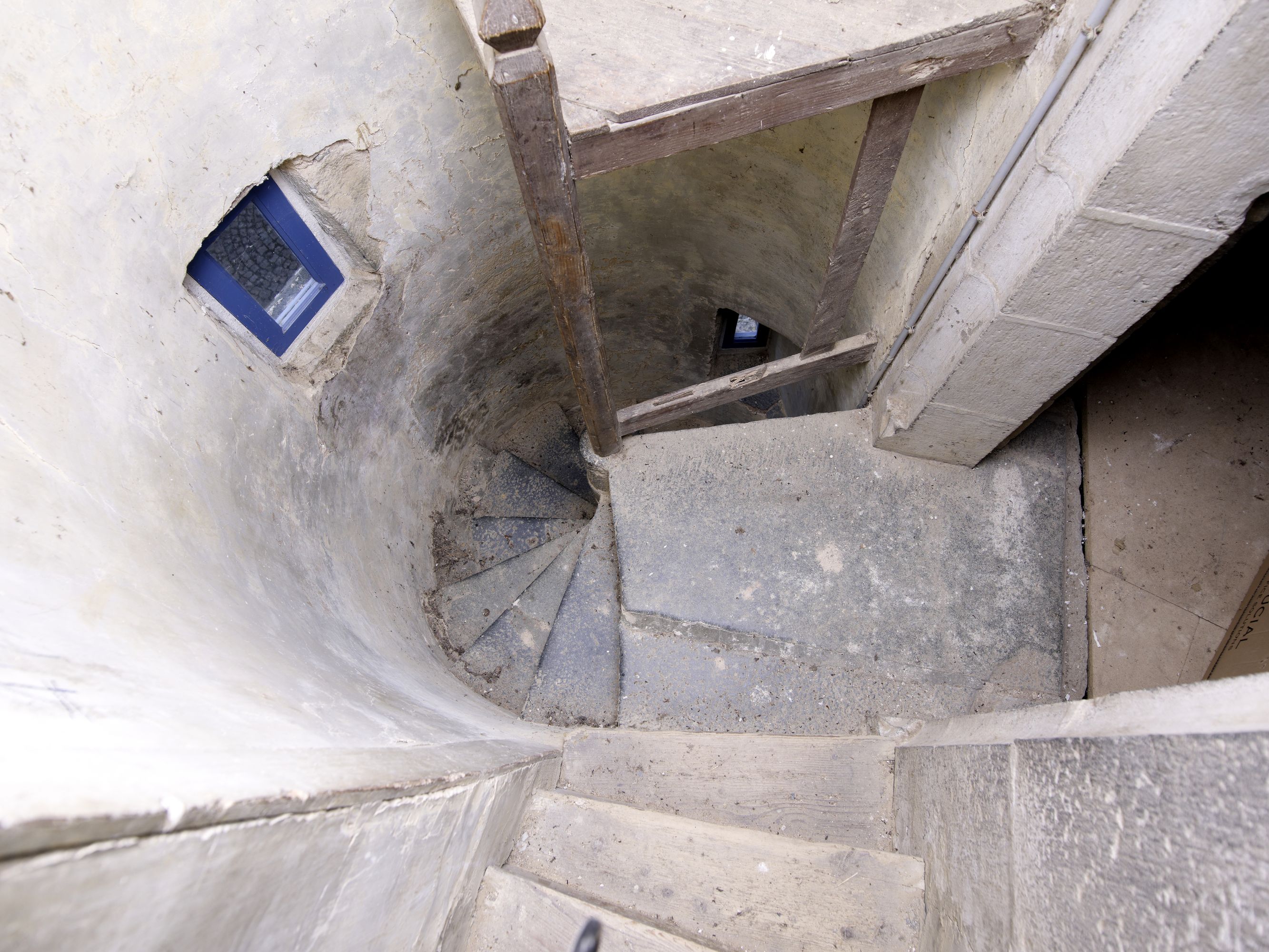 Tour d'escalier. Intérieur de la vis d'escalier secondaire menant à la pièce haute située au-dessus de la tour d'escalierImmatriculation