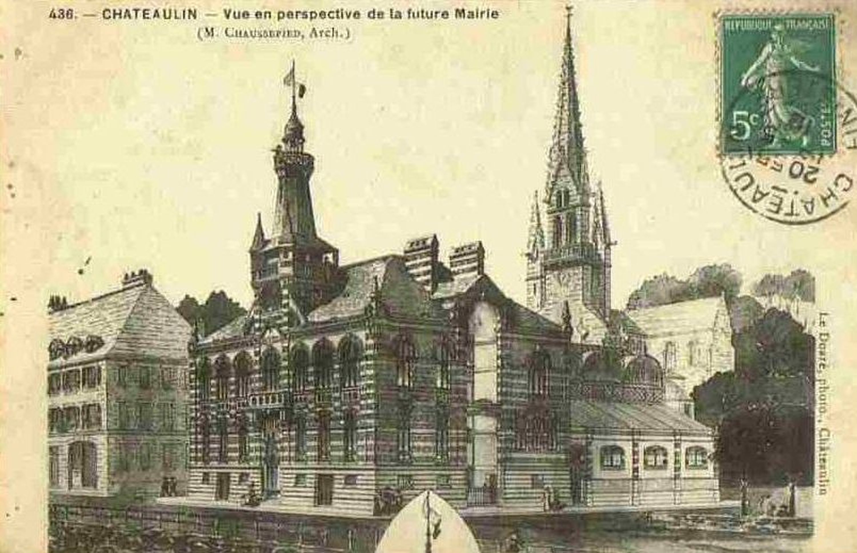 Châteaulin, Vue en perspective de la future mairie (A. Chaussepied). Carte postale, entre 1911 et 1925.Immatriculation