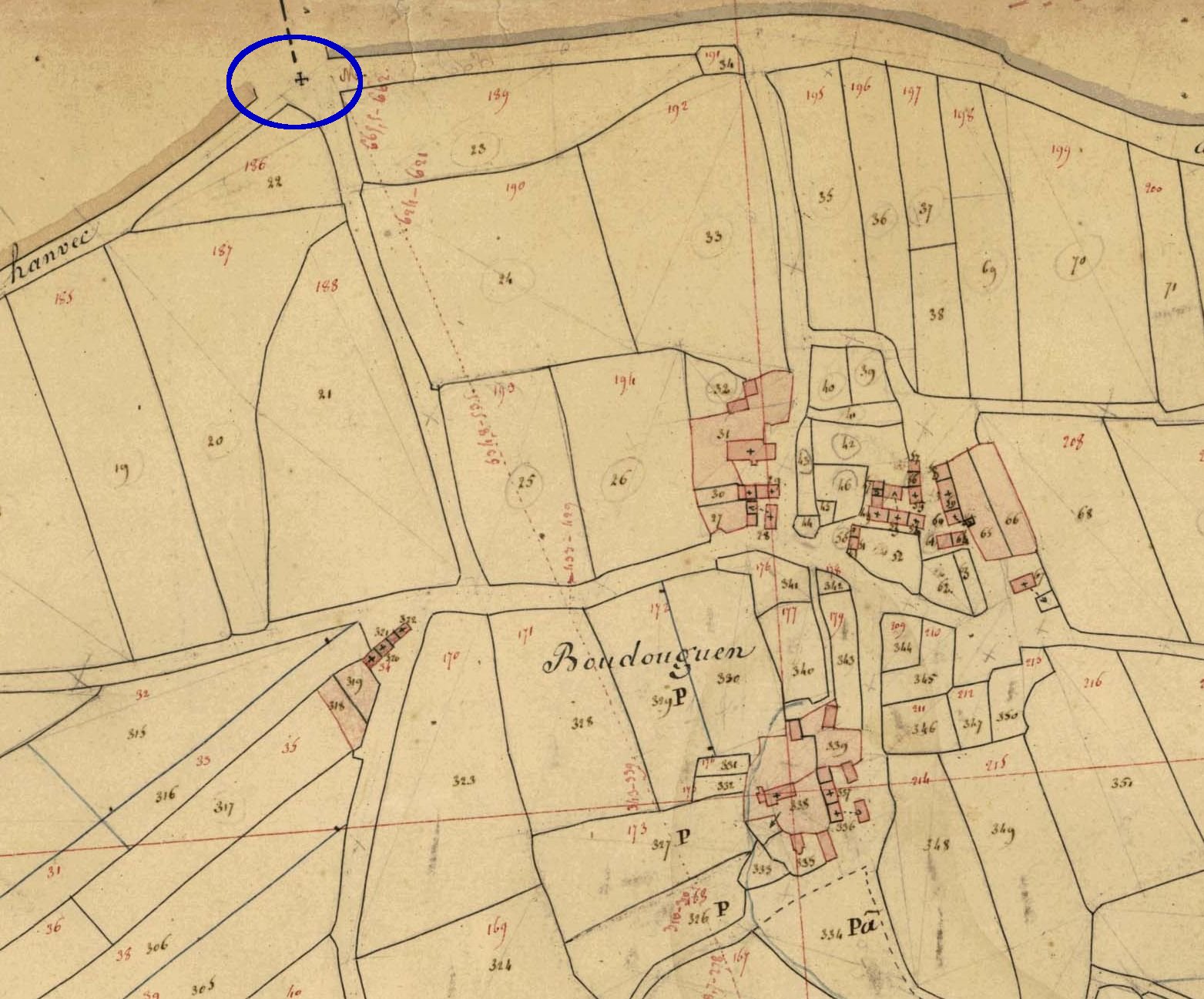 Emplacement de la croix de Boudouguen en 1824. Extrait du cadastre ancien (A.D. 29, série 3P 2/19. Section E1)Immatriculation