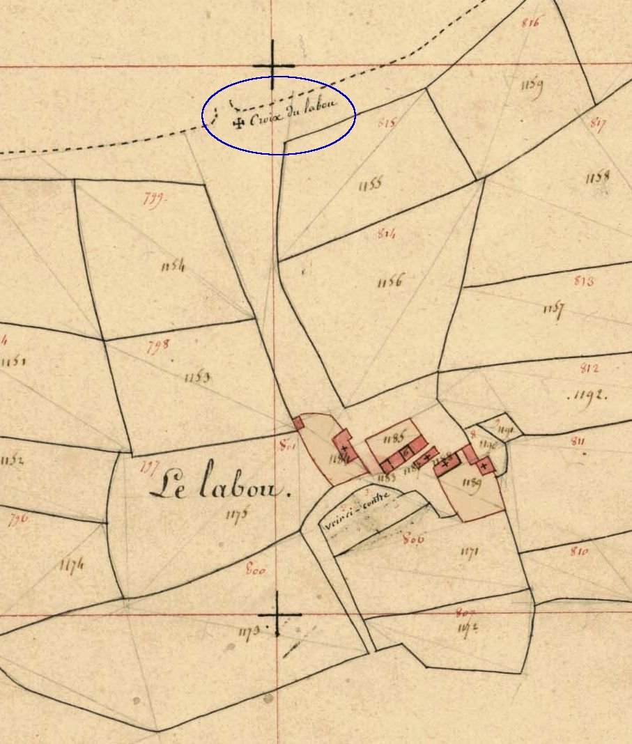 Emplacement de la croix du Labou en 1824. Extrait du cadastre ancien (A.D. 29, série 3P 2/19. Section D3)Immatriculation