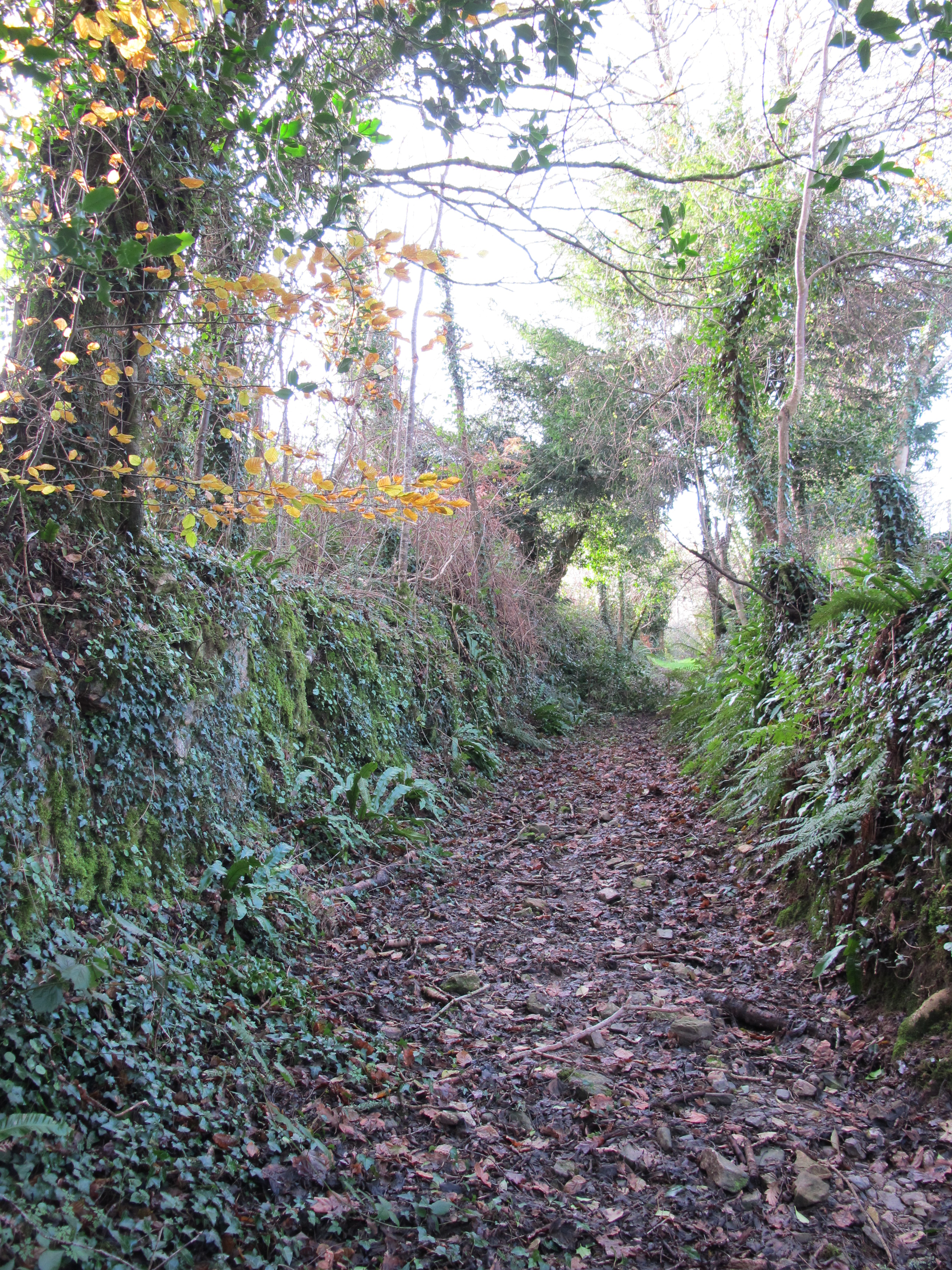 Kernévez. Chemin creux bordé de talus empierrés et boisésImmatriculation
