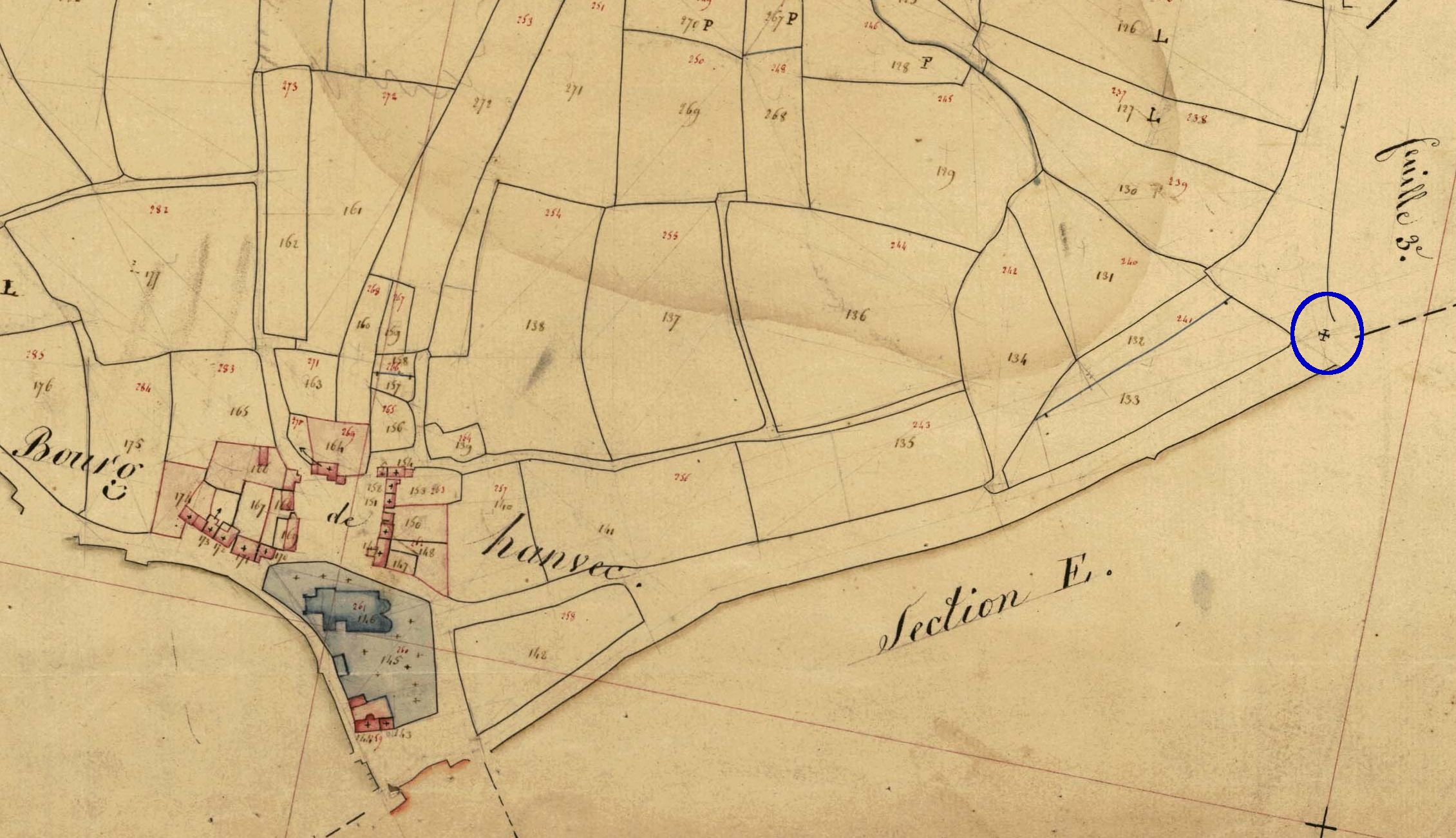 le village d'Hanvec et la croix de Croas ar Halvé en 1824. Extrait du cadastre ancien (A.D. 29, série 3P 2/19. Section B1)Immatriculation
