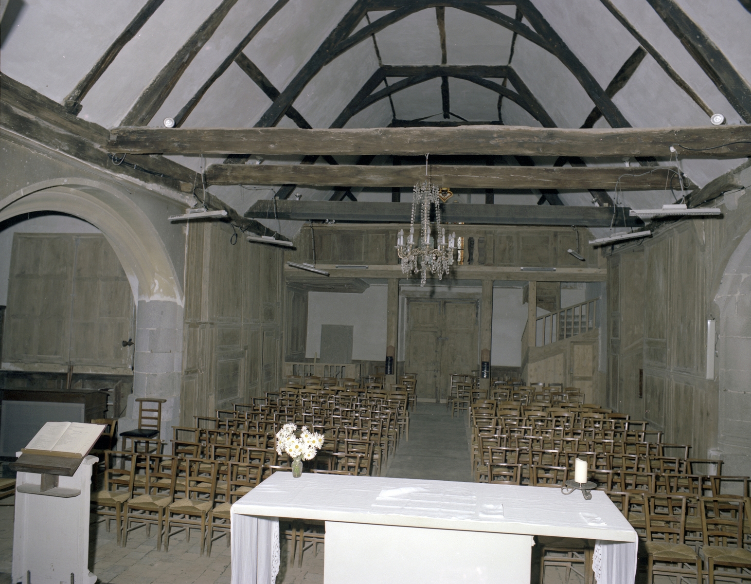 Vue intérrieure de l'église, prise du choeur vers le bas de la nef, vers 1980Immatriculation