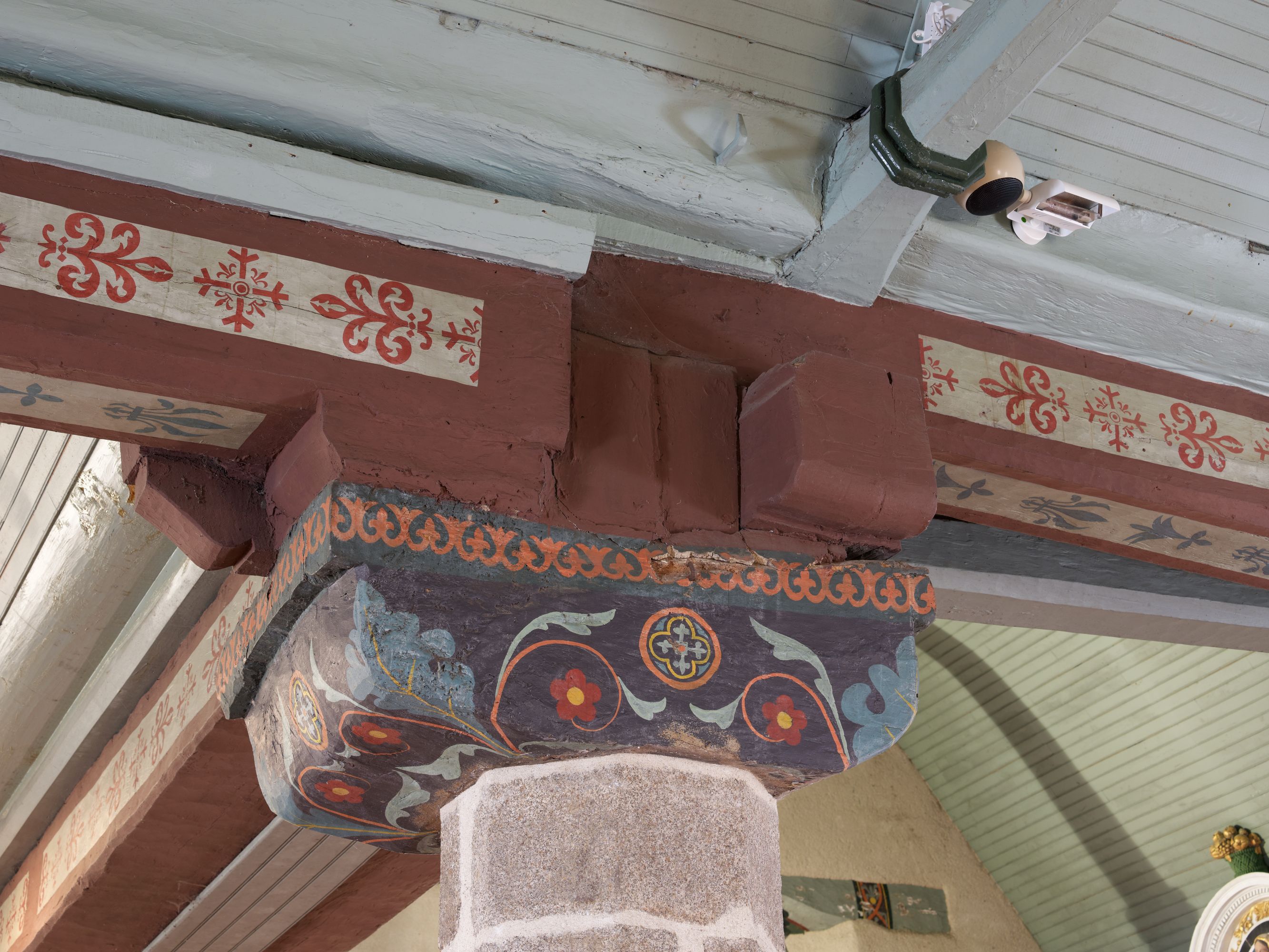 Détail du chapiteau en bois peint de motifs florauxImmatriculation