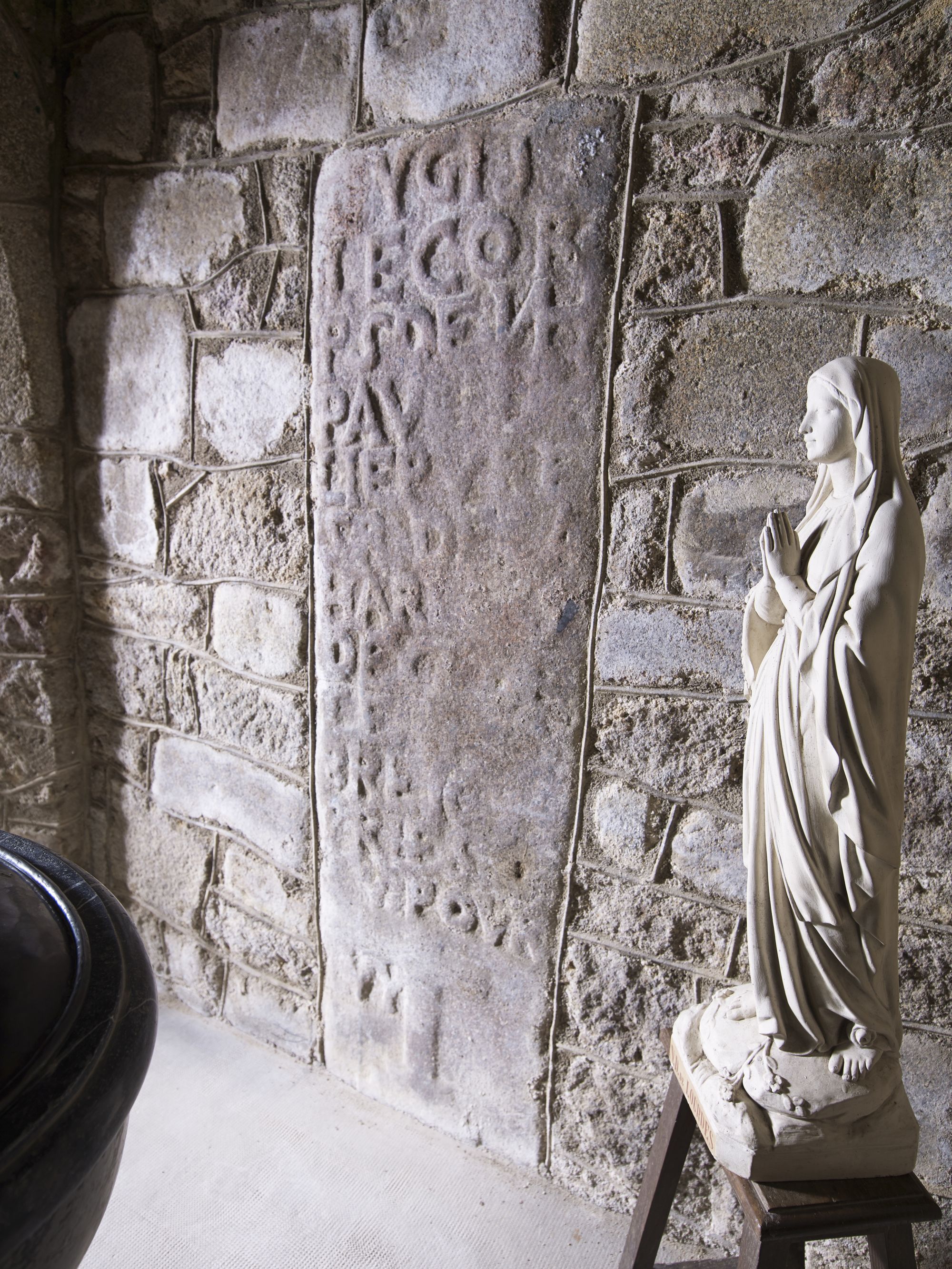 Pierre tombale remployée dans la maçonnerie de l'égliseImmatriculation