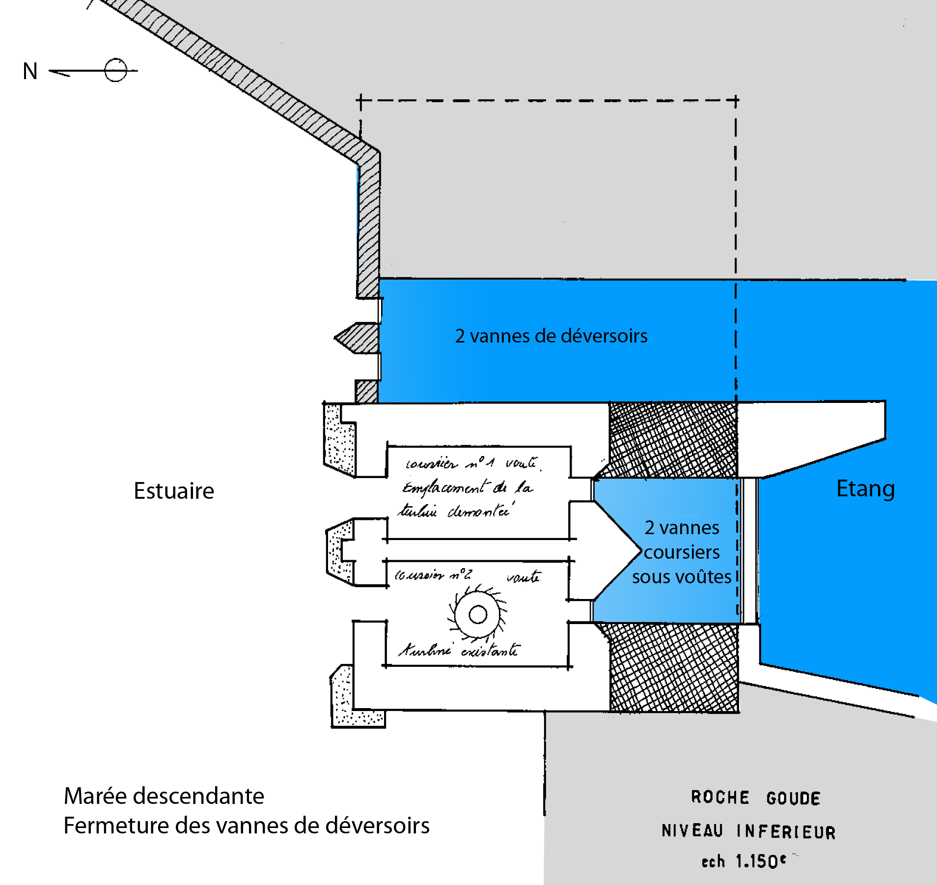 Le principe de fonctionnement des moulins à marée, sur l'exemple du Moulin de Rochegoude, situé à Saint-Briac. Phase 3 : Marée descendante, fermeture des vannes de déversoirsImmatriculation