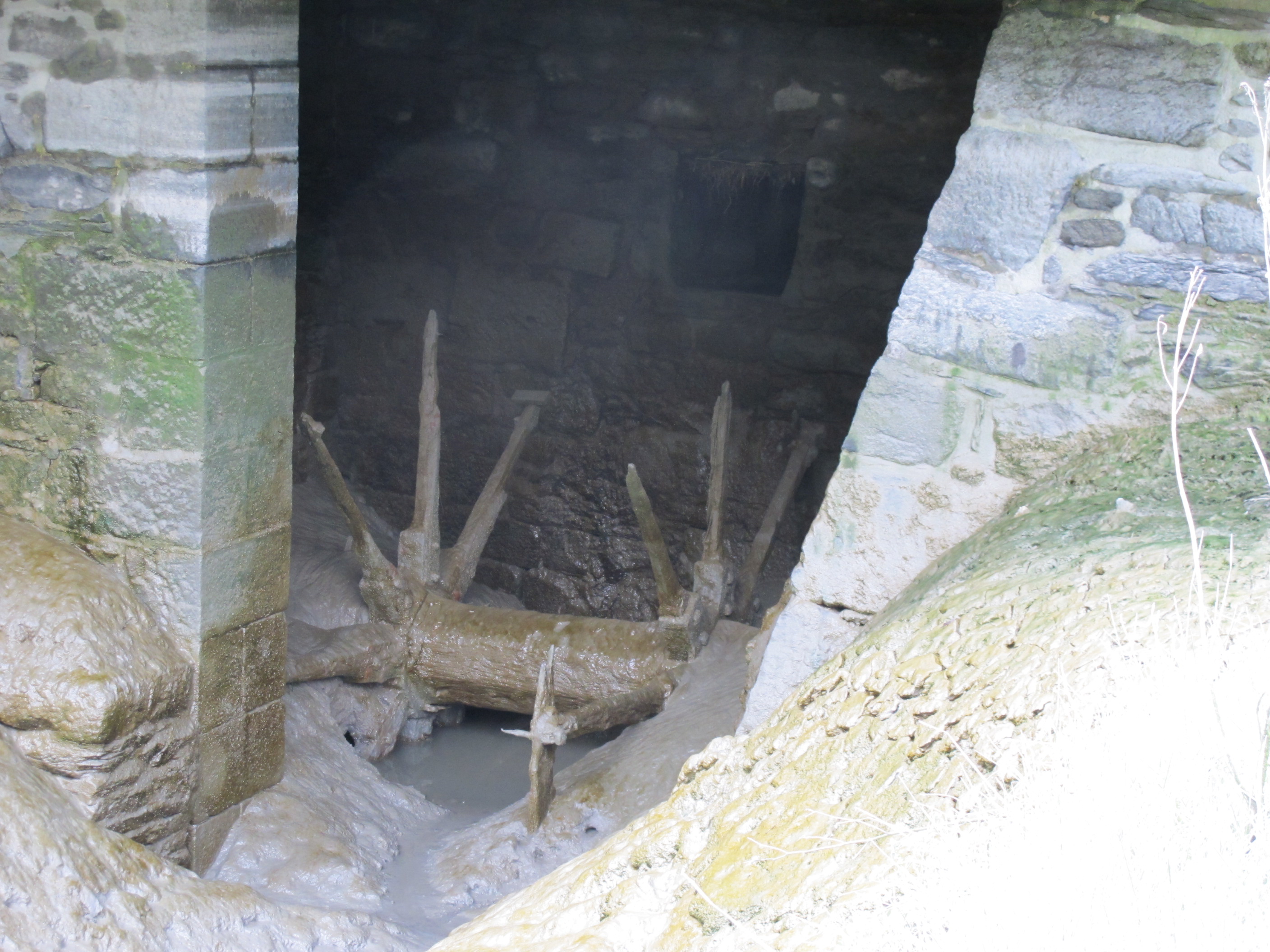 Détail de l'ancien coursier et des vestiges de la roue hydraulique du moulin de Bellenray, situé à Saint-LormelImmatriculation