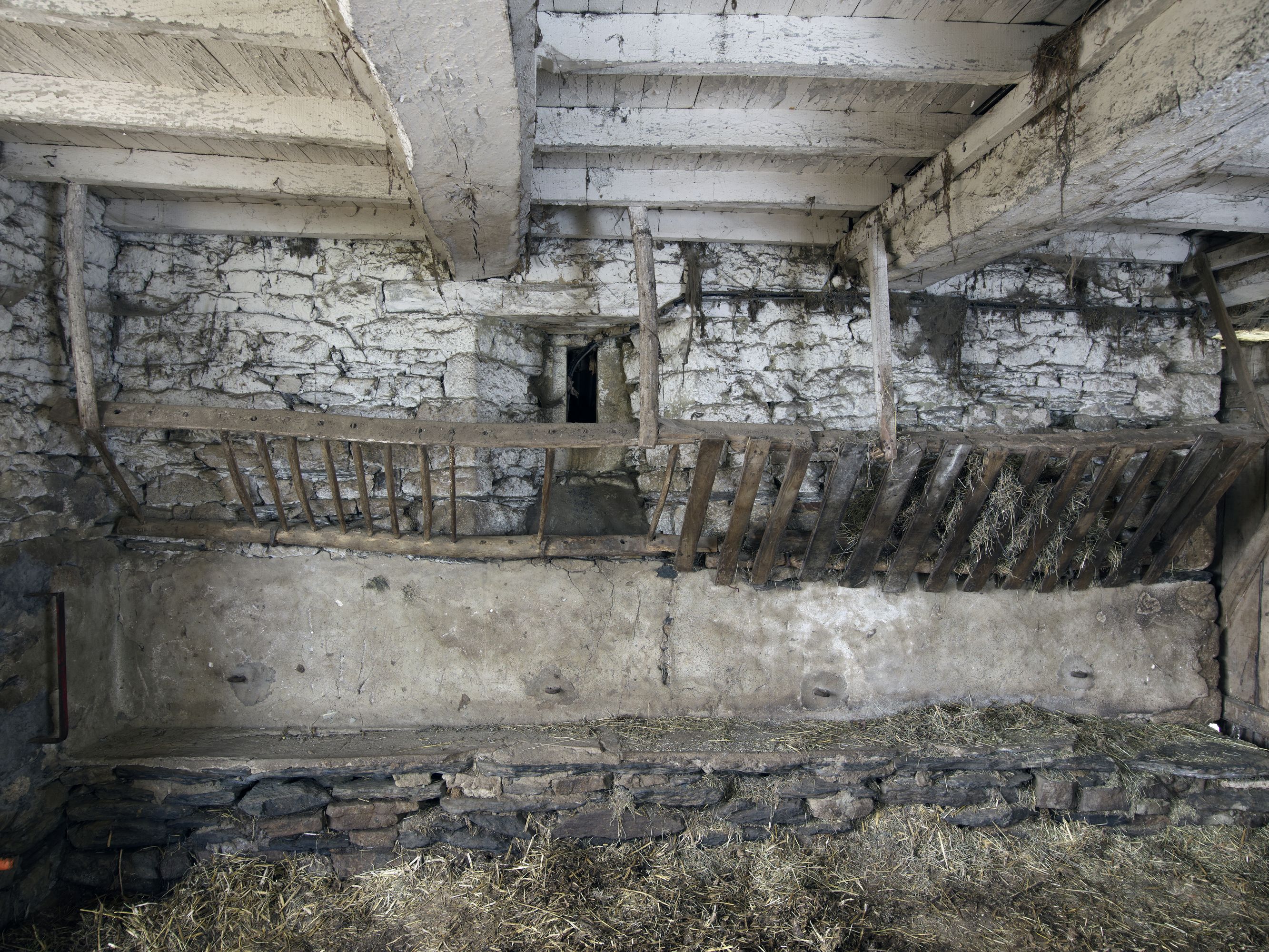 Vue des mangeoires de l'étable et du plafond à poutres chanfreinéesImmatriculation