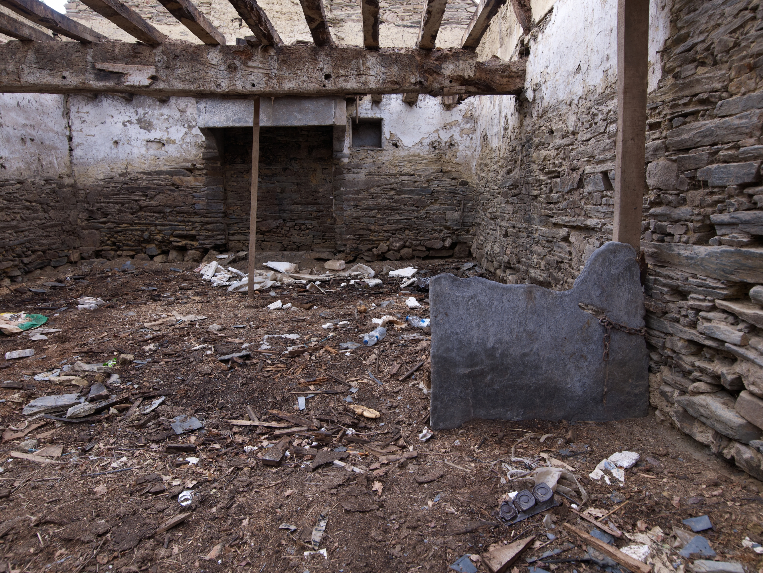 Ferme, logis jumelé ouest : vestige de la cloison en palis qui séparait la salle de l'étable (état en 2013)Immatriculation