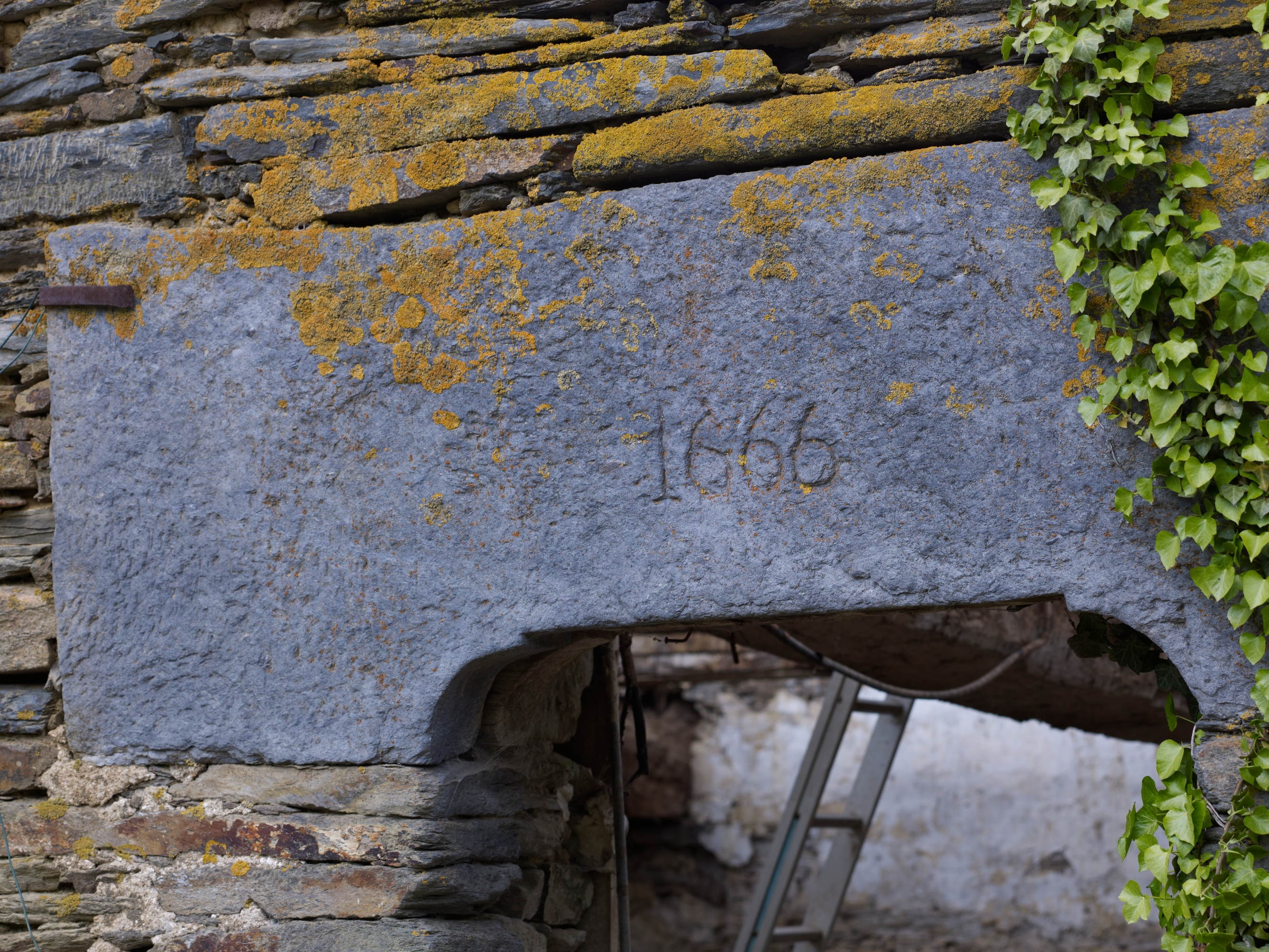 Ferme, élévation sud des logis : linteau portant la date 1666 (état en 2013)Immatriculation