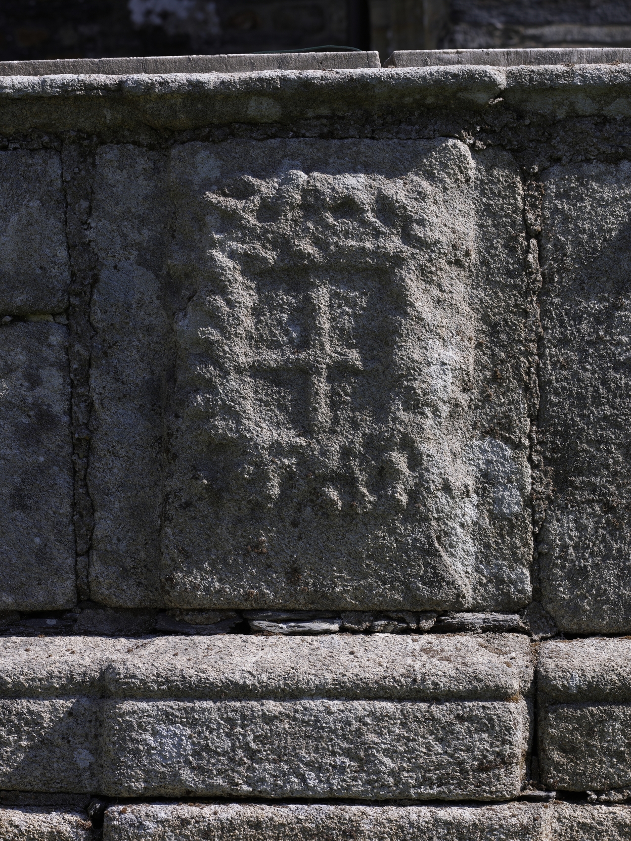 Tombeau, élévation sud : pierre centrale portant des armoiries (état en 2013)Immatriculation
