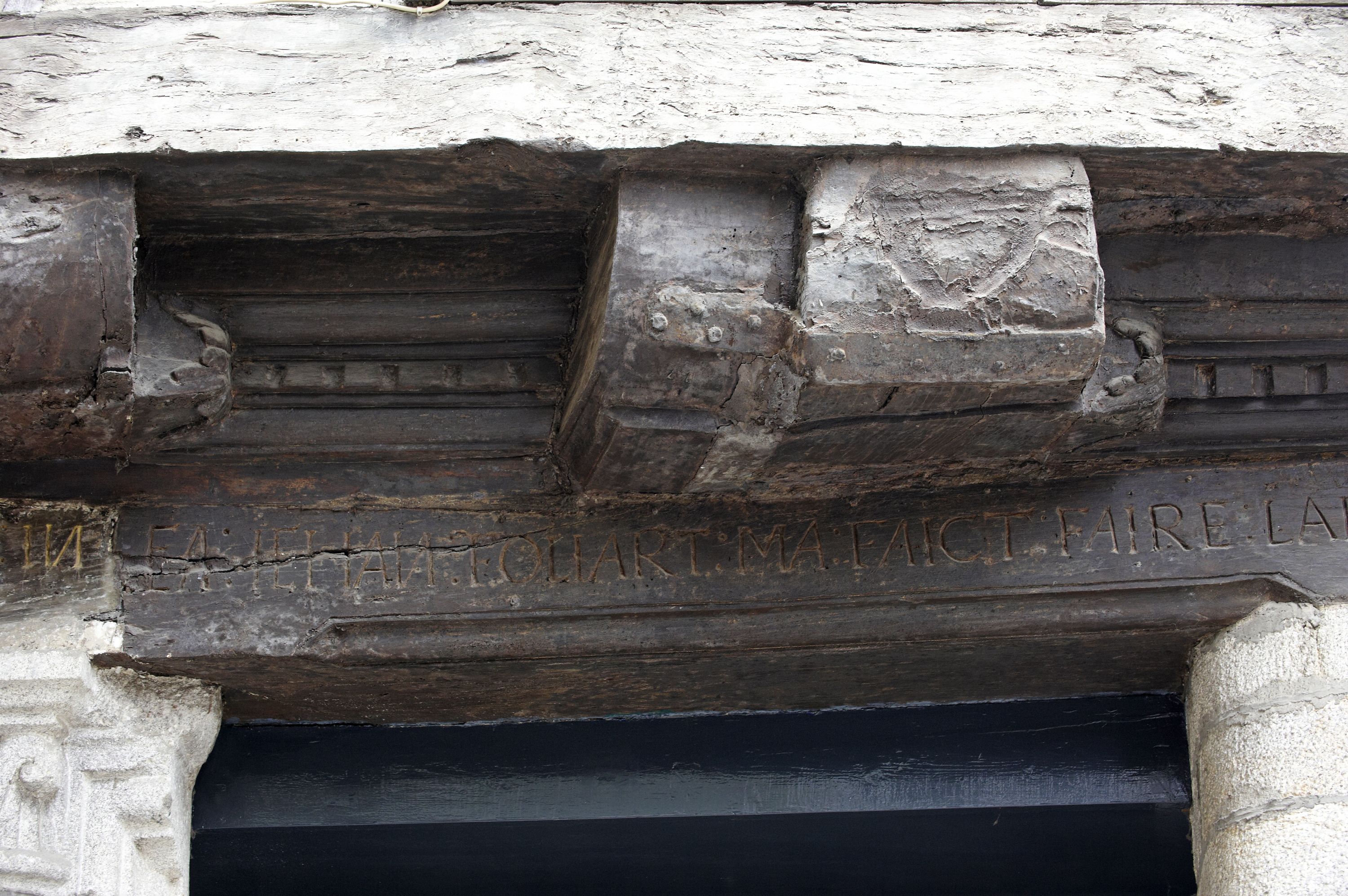 Façade sur rue, encorbellement, premier étage, détailImmatriculation