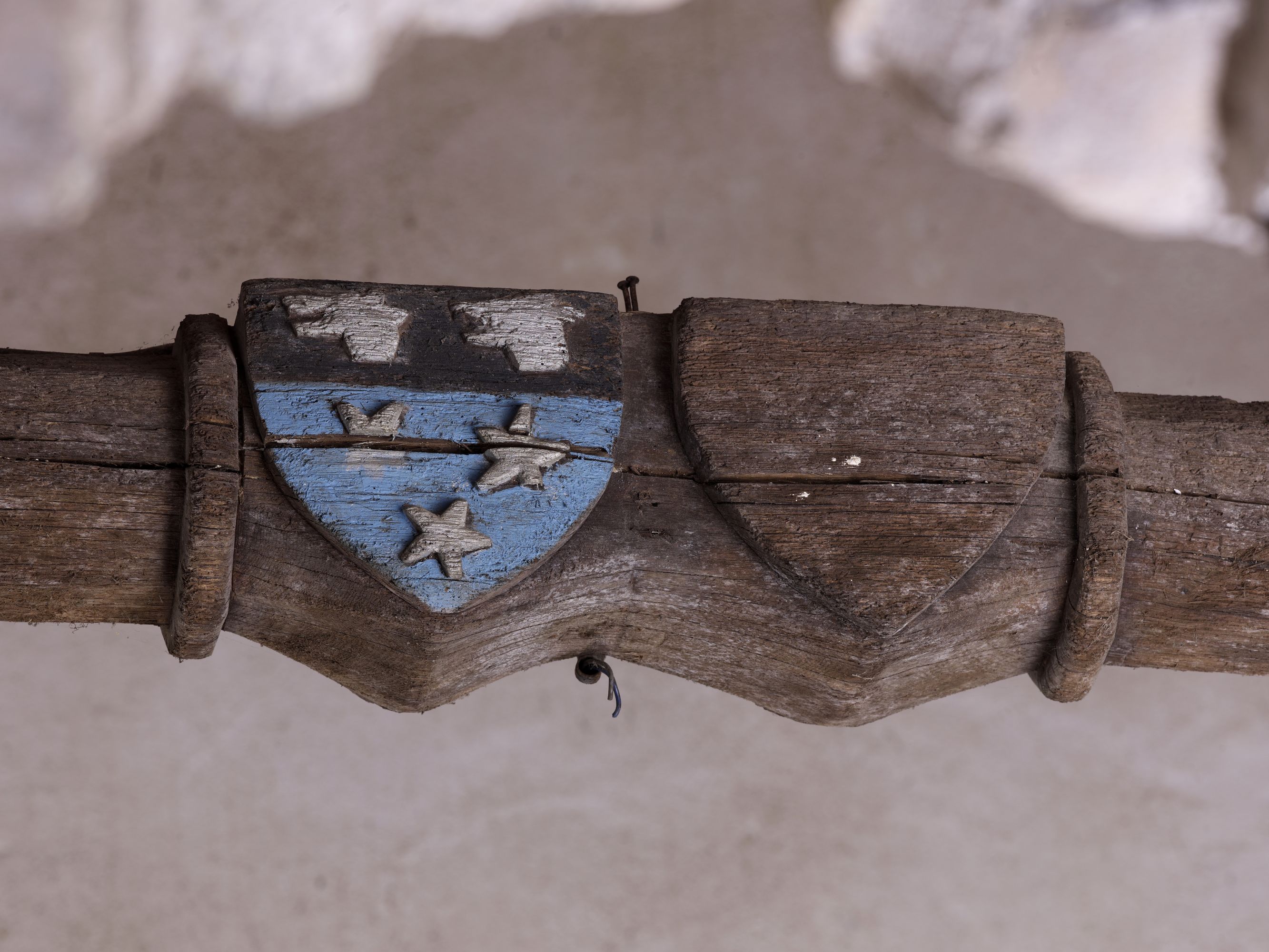 Église, chapelle sud, centre de l'entrait : écus de la famille Mancel (état en 2013)Immatriculation