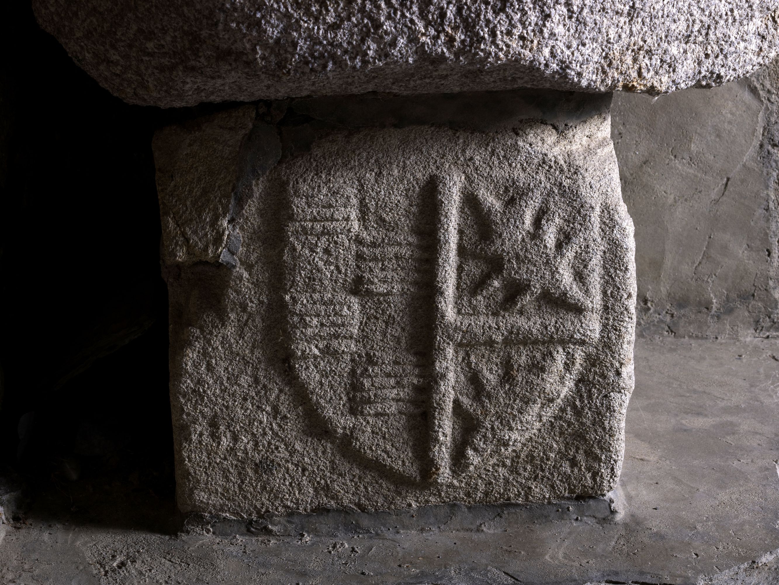 Soubassement : armoiries de la famille de la Houssaye et de la famille du Houx (?) (état en 2013)Immatriculation