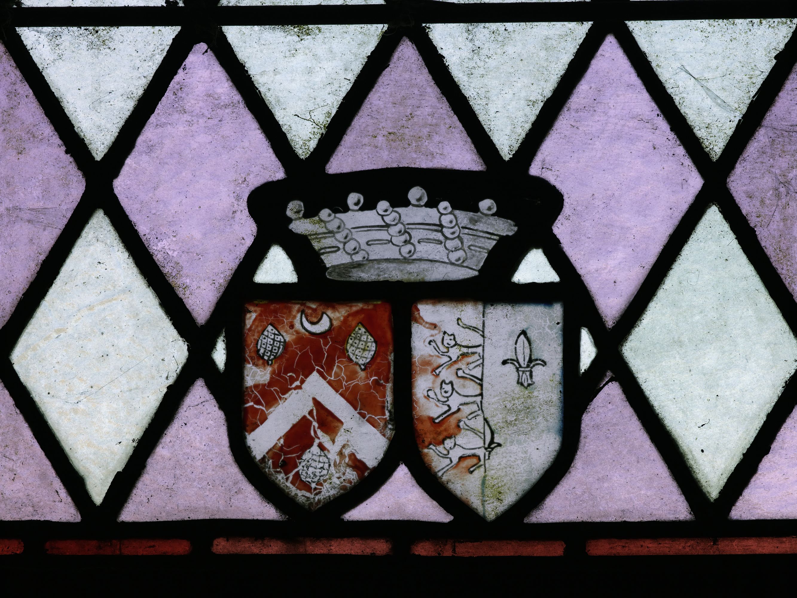 Verrière ouest du bras nord : armes en alliance de Jean-Marie Roullet de la Bouillerie et Anne Marie de GoulaineImmatriculation
