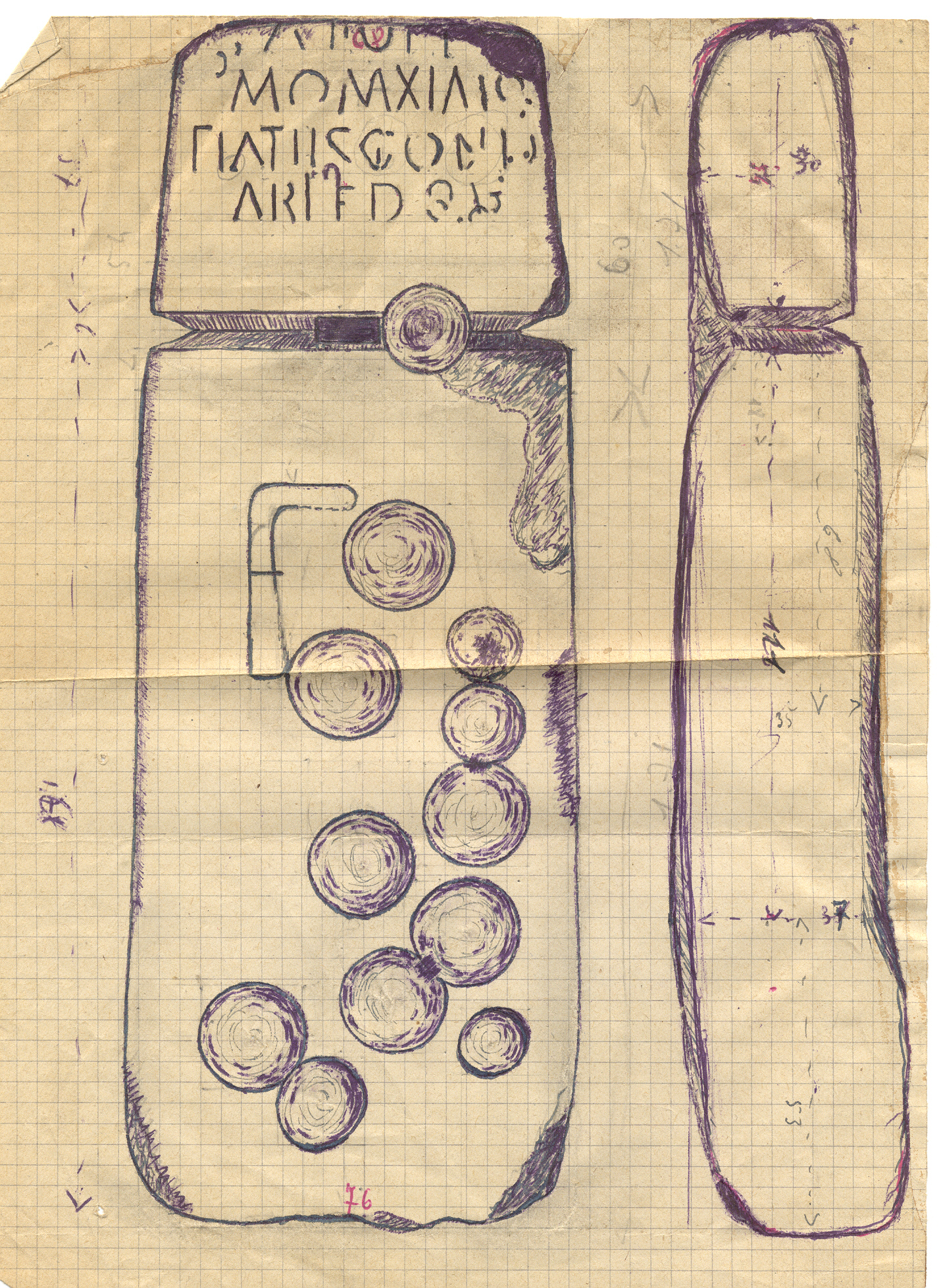 Dessin du menhir romanisé et à cupules aujourd'hui situé devant la mairie (vers 1960)Immatriculation