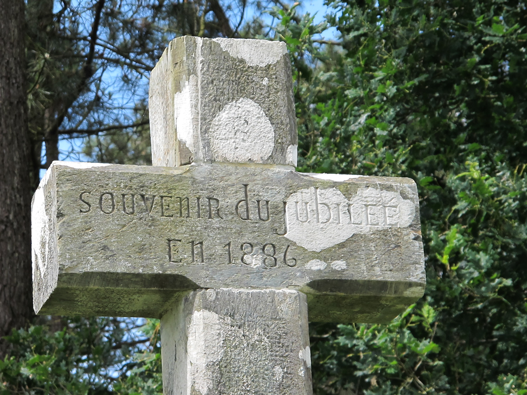 Le Bois Brun, croix de mission, inscription à la croisée : Souvenir du jubilée en 1886 (état en 2013)Immatriculation