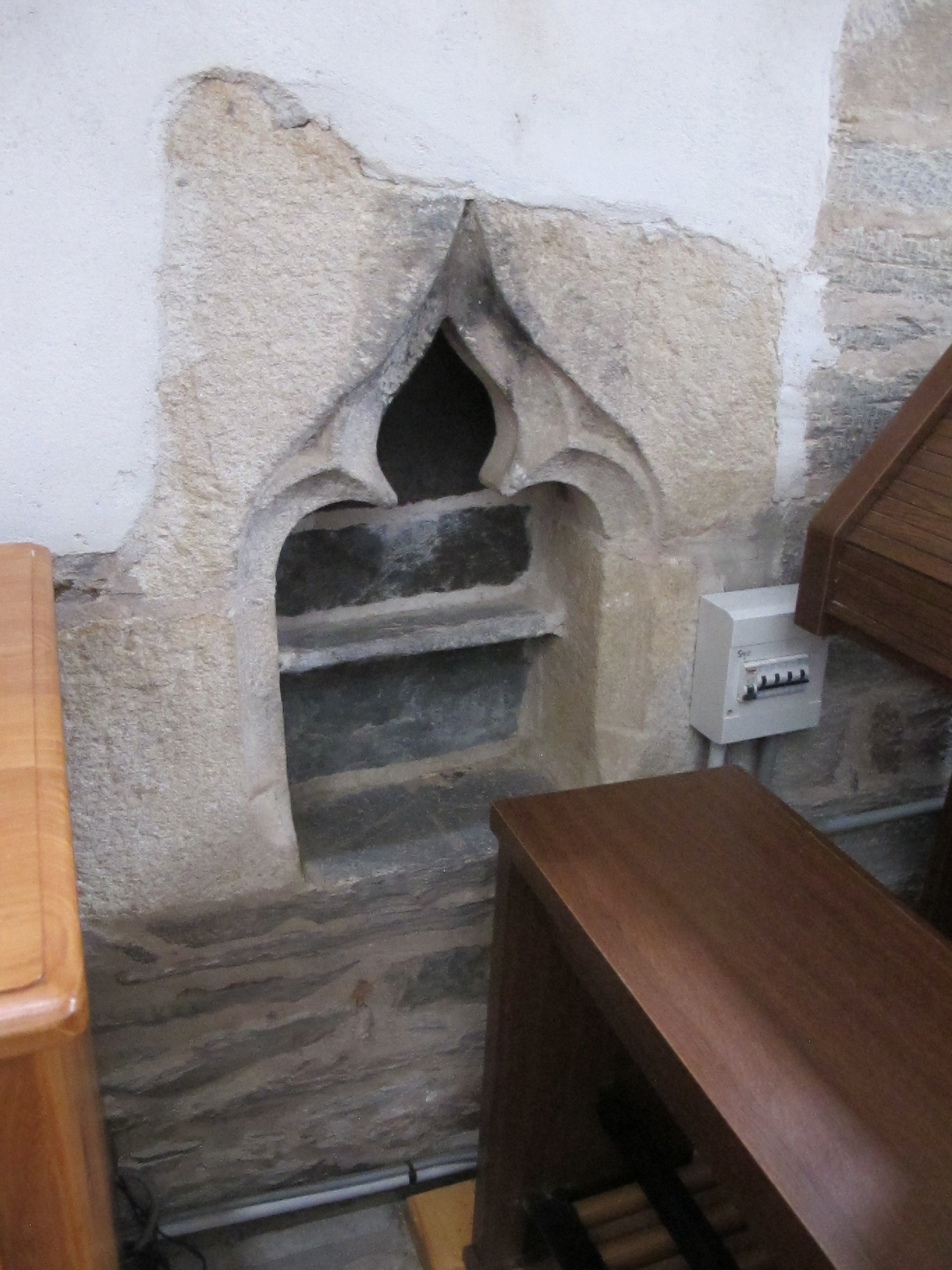 Église, chapelle nord, mur est : lavabo-crédence trilobée (état en 2013)Immatriculation
