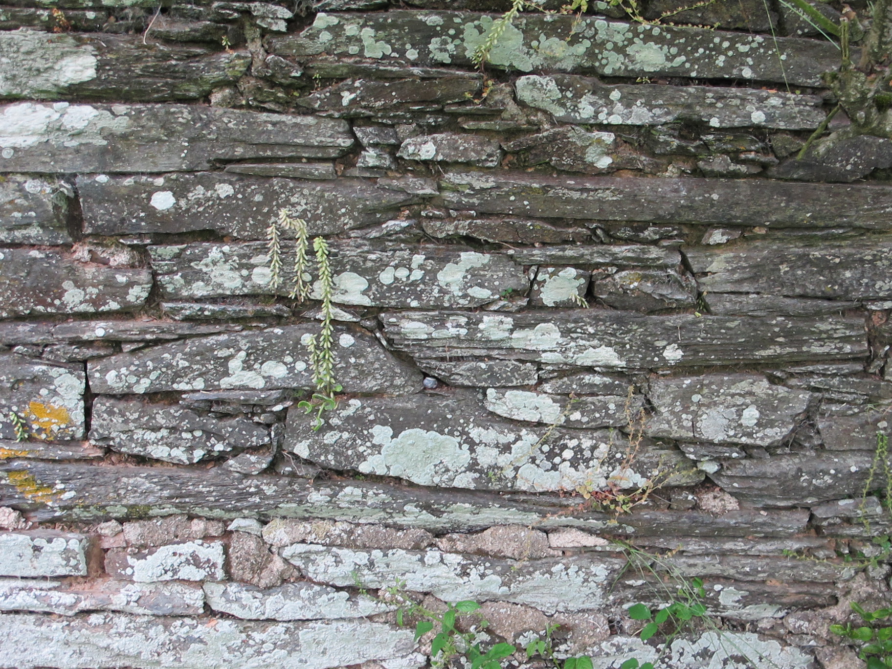 Vestiges de maison 1 : mise en oeuvre des dalles de schiste en carreaux et boutisses dans l'angle sud-ouestImmatriculation