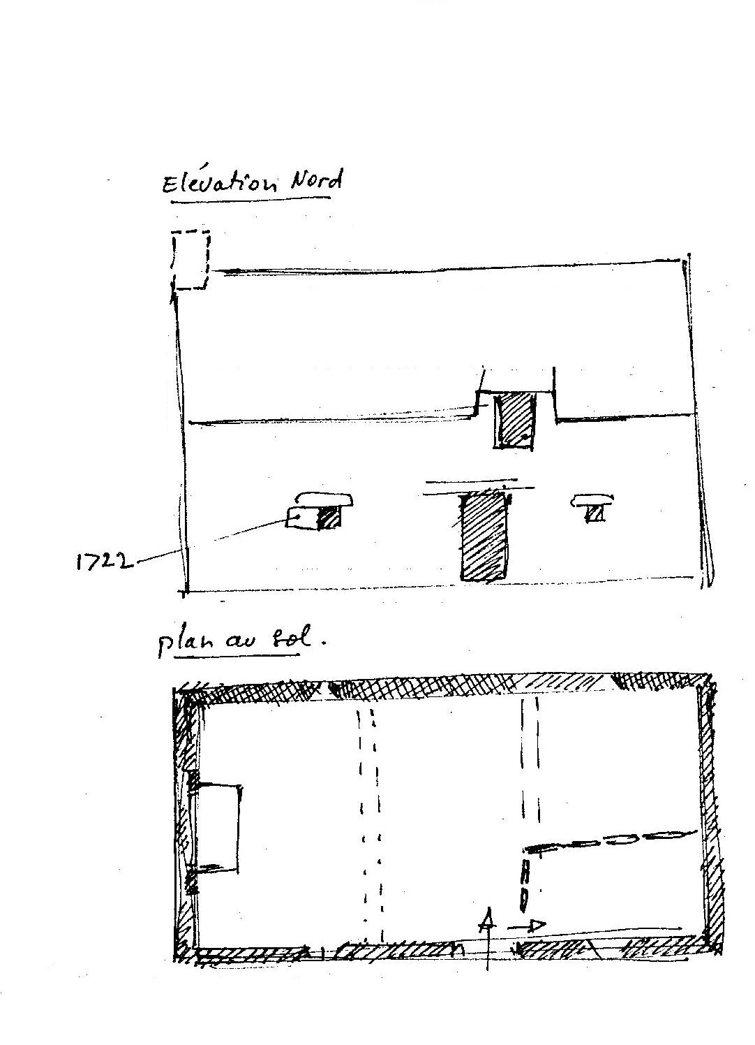 Cournon, la Buissonnaie : élévation nord et plan au sol du rez-de-chaussée (schéma réalisé par J. P. Ducouret en 1983)Immatriculation