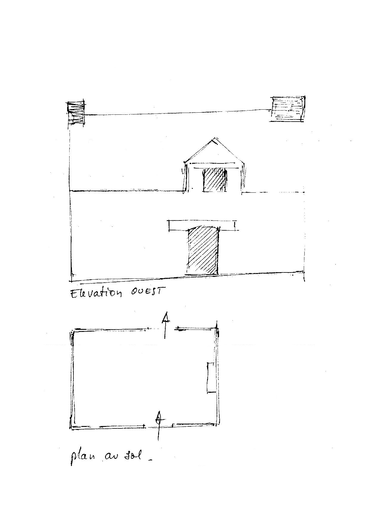 Maison : élévation ouest et plan au sol (schéma réalisé par J. P. Ducouret en 1983)Immatriculation