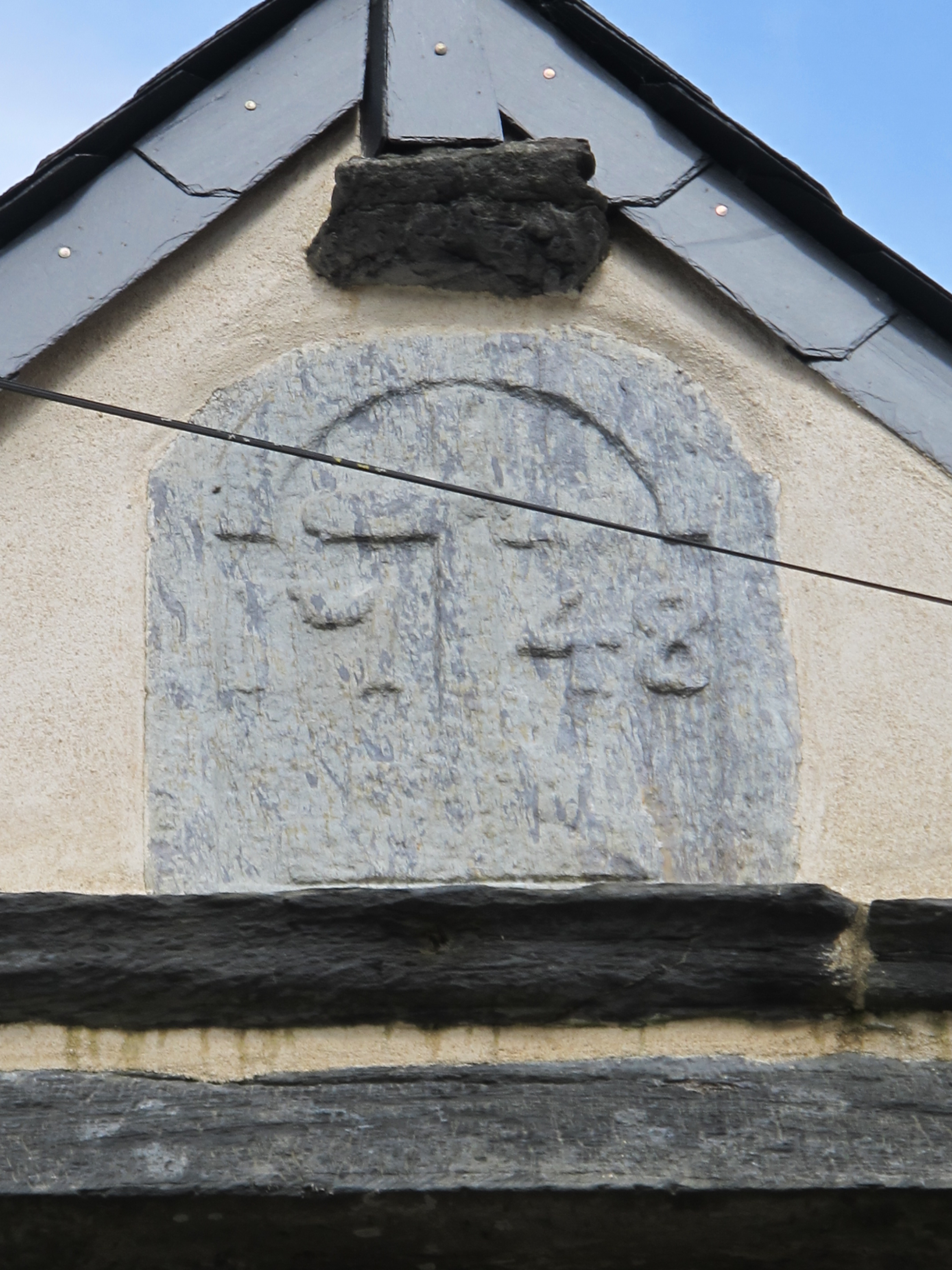 Maison : fronton de la lucarne portant la date 1748 de part et d'autre d'une croix (état en 2013)Immatriculation