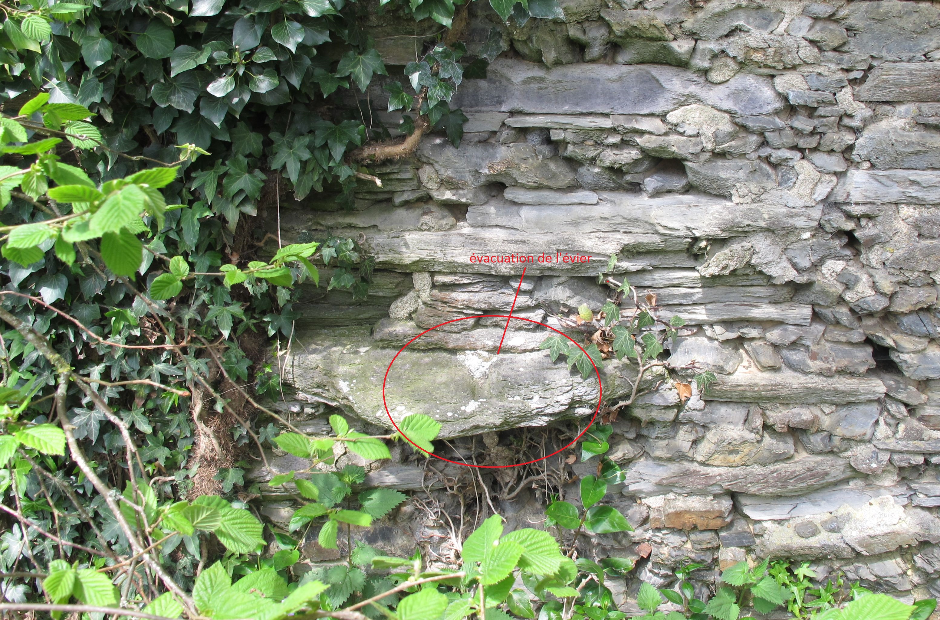 Maison, mur sud : à l'extérieur, évacuation de l'évier (au centre de l'image) (état en 2013)Immatriculation