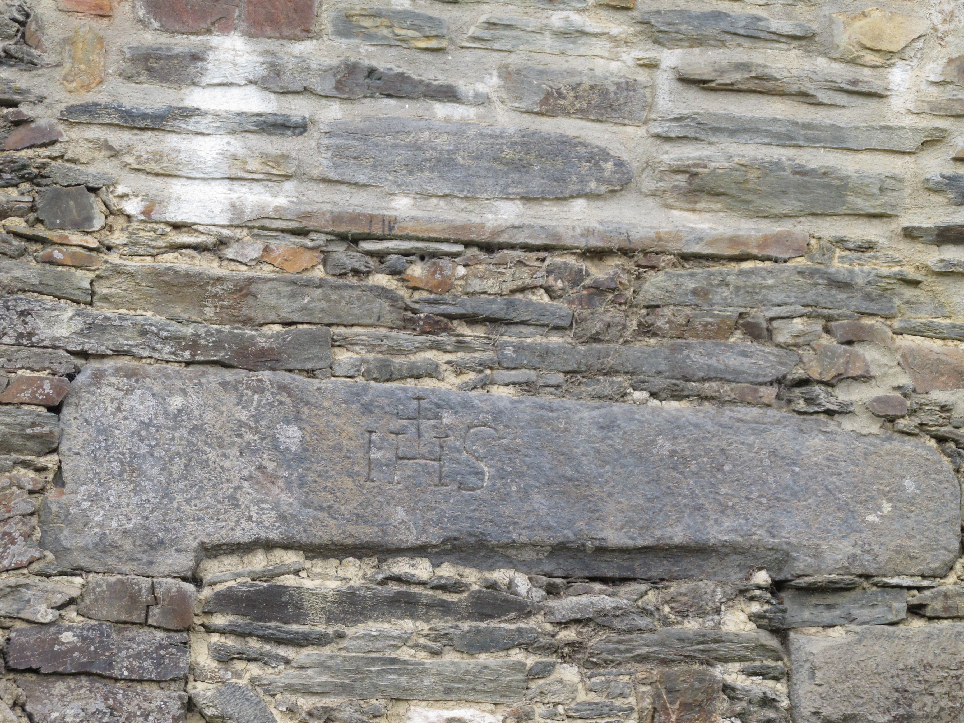 Édifice (parcelle 337) : linteau de porte en schiste portant l'inscription gravée IHS (état en 2013)Immatriculation