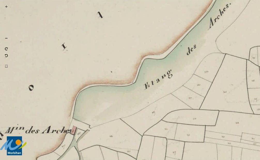 Le moulin à eau des Arches sur le cadastre de 1829 (A. D. du Morbihan, 3 P 244/5)Immatriculation