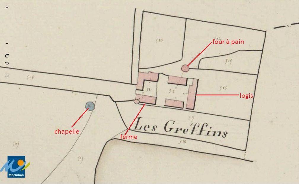 Le manoir des Greffins sur le cadastre de 1829 (A. D. du Morbihan, 3 P 244/18)Immatriculation