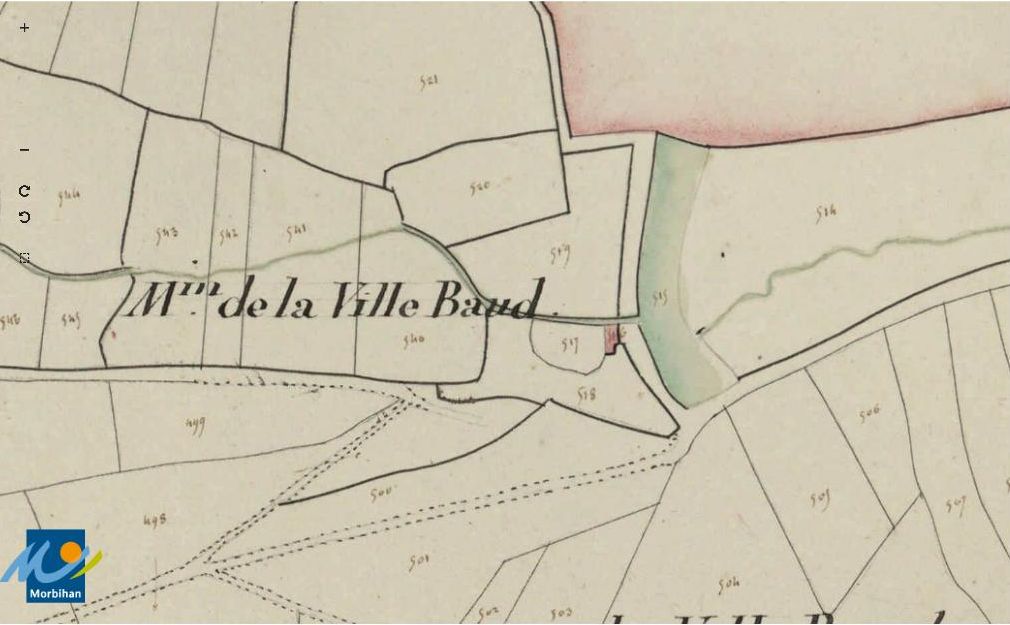 Le moulin à eau de la Ville-Baud sur le cadastre de 1829 (A. D. du Morbihan, série 3 P 286/11)Immatriculation