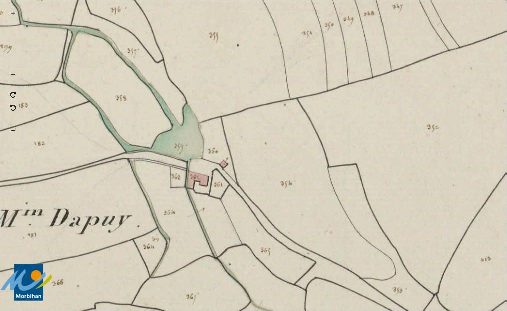 Le moulin à eau de Dapuy sur le cadastre de 1829 (A. D. du Morbihan, série 3 P 286/14)Immatriculation